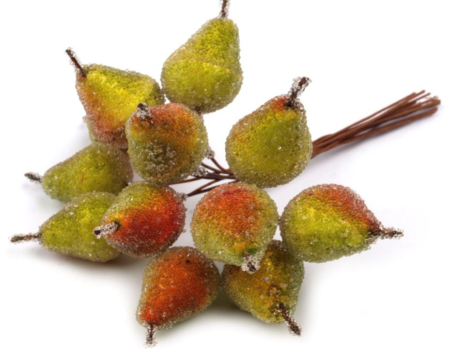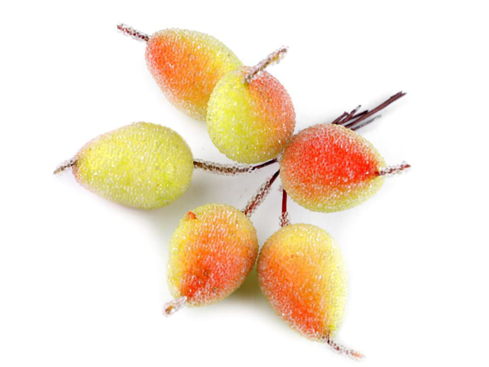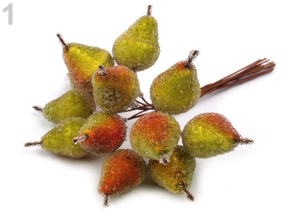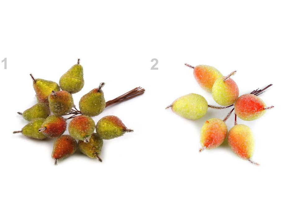 Použití: Hrušky jsou dobrou ozdobou podzimních vazeb, věnců, ikebany apod. Lze je lehce napichovat na polystyrenové polotovary a dále zdobit.
