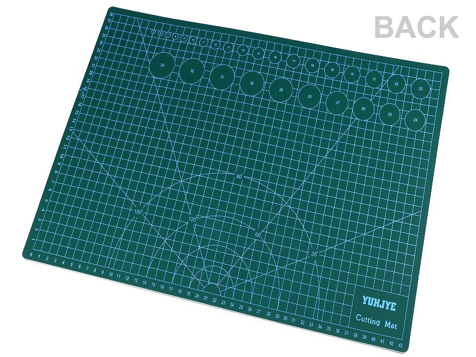 Je oboustranná, vyrobená z tvrdého materiálu, který brání přeříznutí, ale zároveň neztupí čepel nože. Na jedné straně podložky je vyznačena síť v cm s úhly. Také na ní najdete šikovnou vzorkovnici průměrů koleček a čtverečků od 2 mm do 10 mm. Druhá strana je rozměřena po 5 cm.