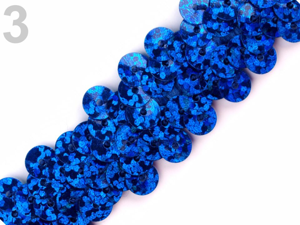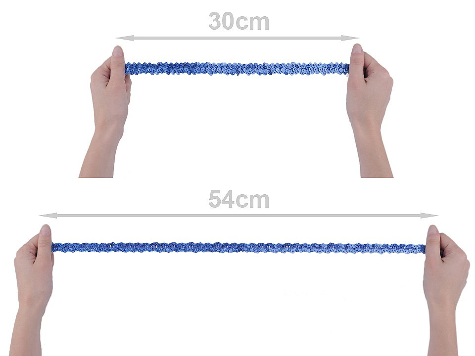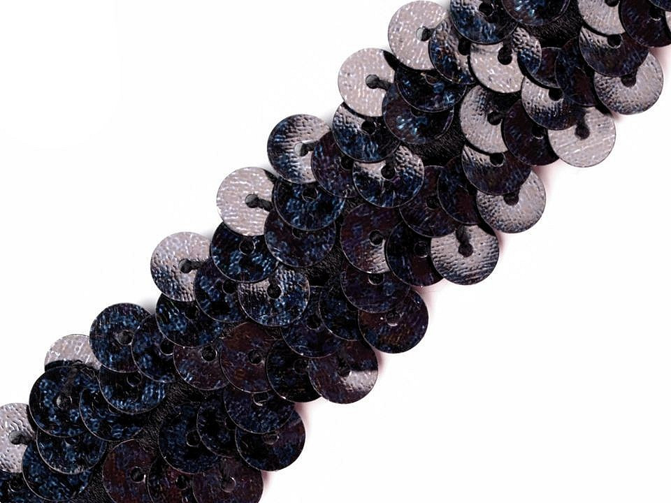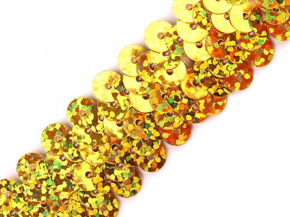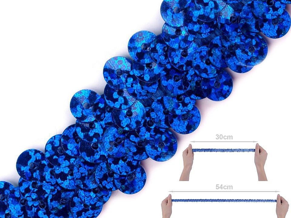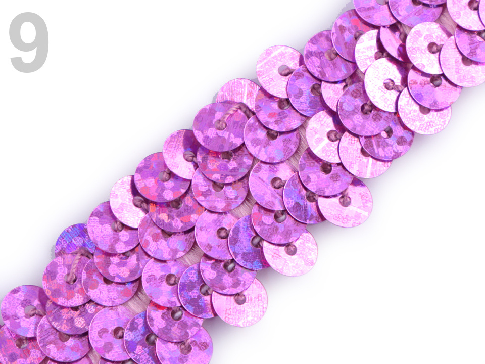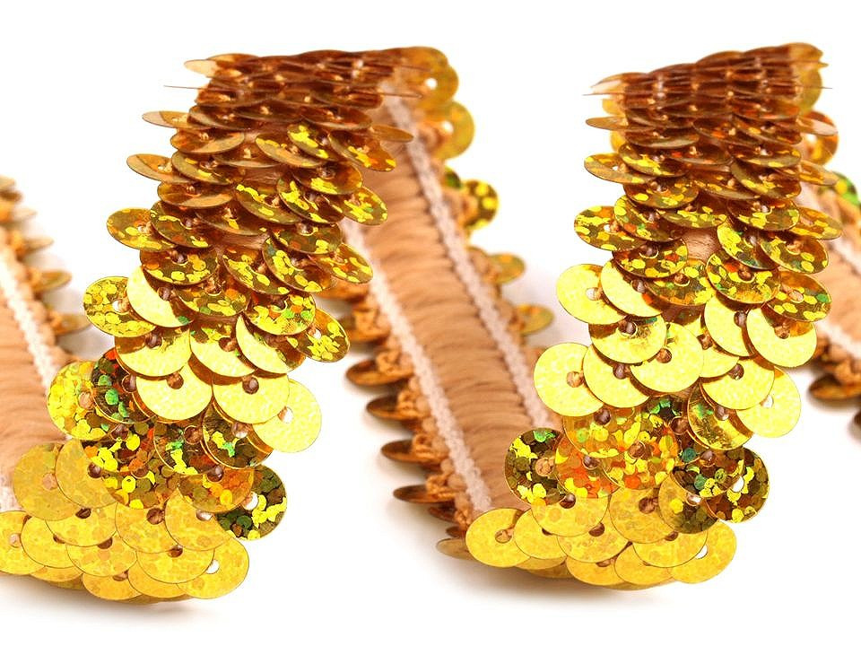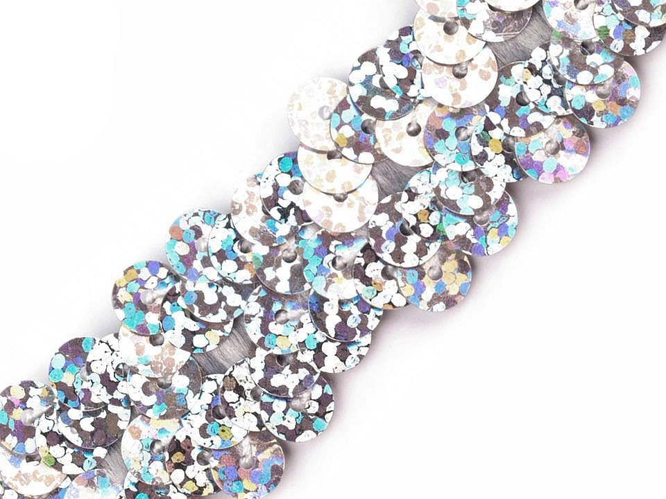 Prýmek zdobí našité hologramové flitry. Díky gumě ve spodní části je elastický.