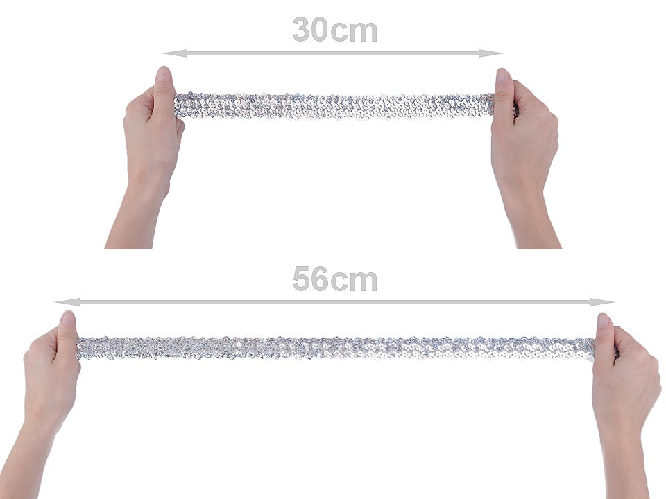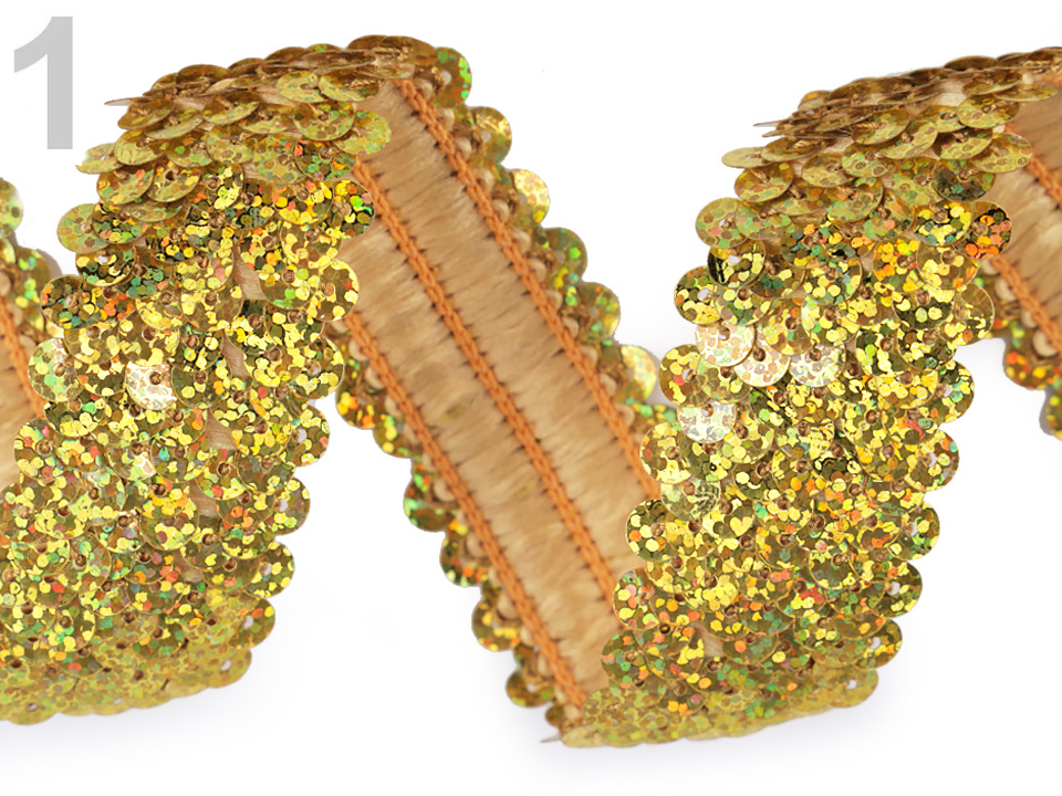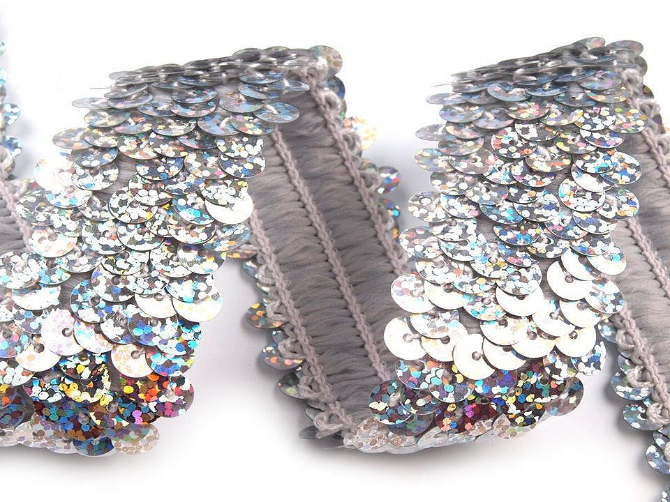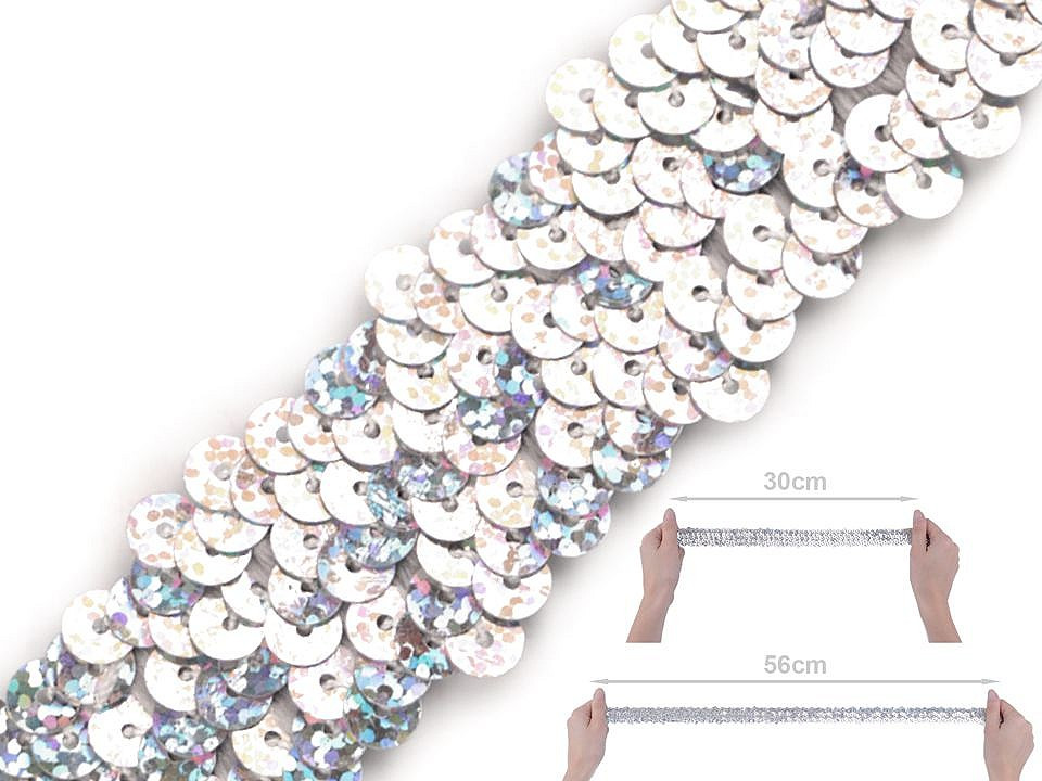 Prýmek zdobí hustě pošité flitry s hologramem. Díky gumě zašité ve spodní části je elastický. Flitry na prýmku se působivě třpytí.