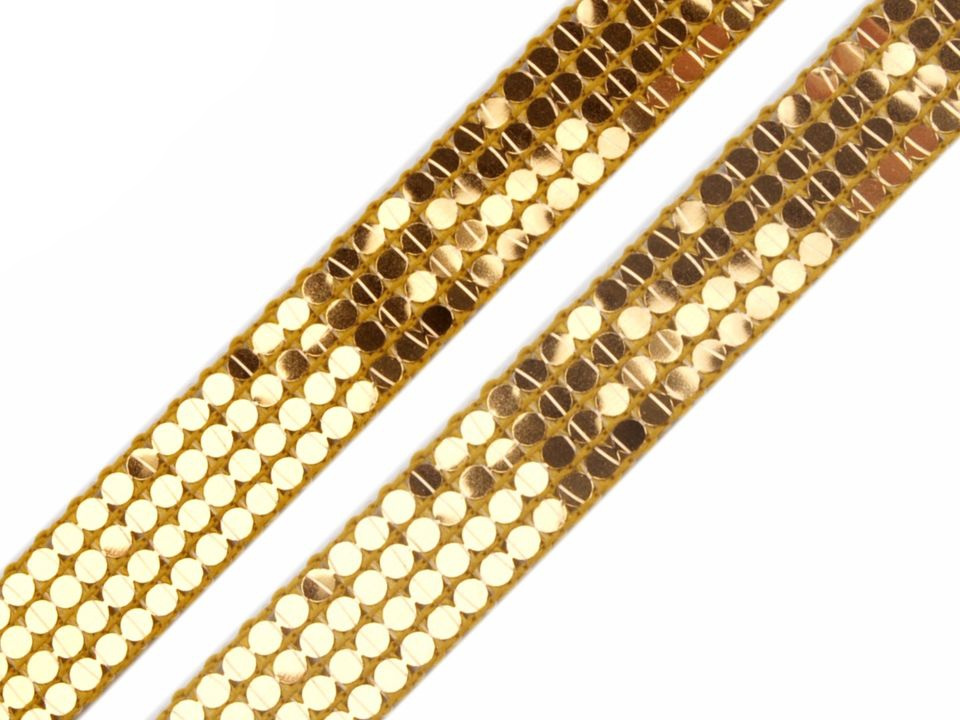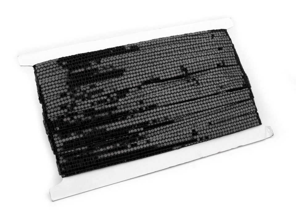 Prýmek působí díky svému třpytu luxusně. Na prýmku jsou vlascem našité pásky s drobnými plastovými flitry. Prýmek je pevný, není pružný. Flitry na prýmku mění lesk dle úhlu pohledu.