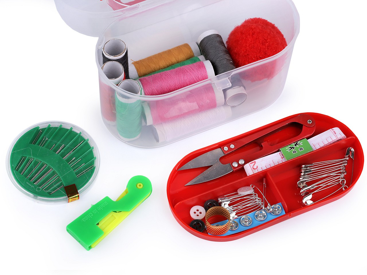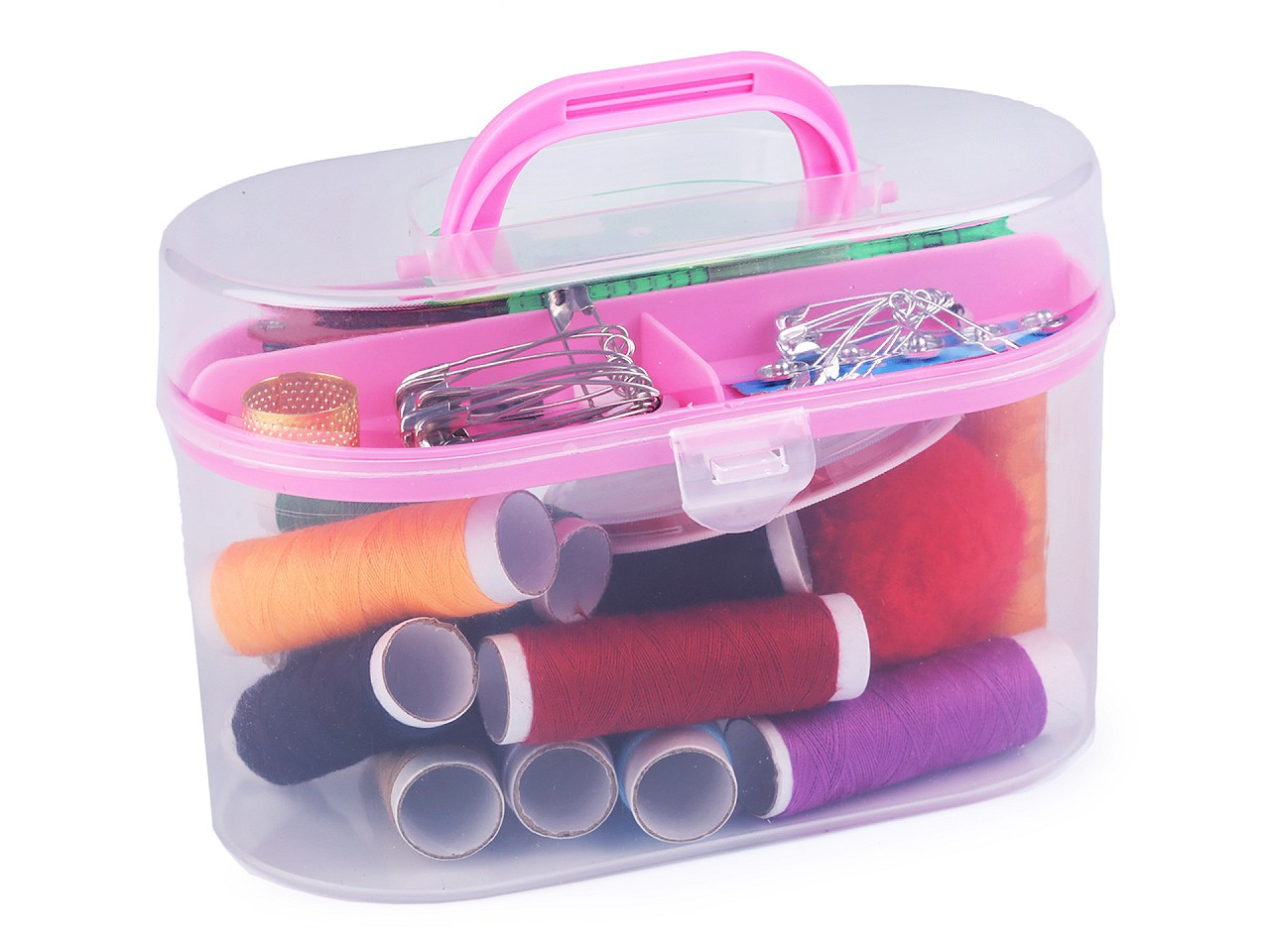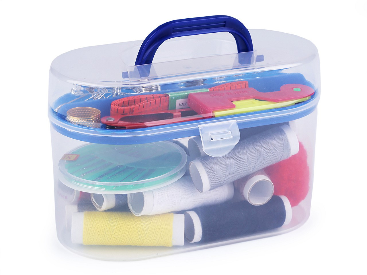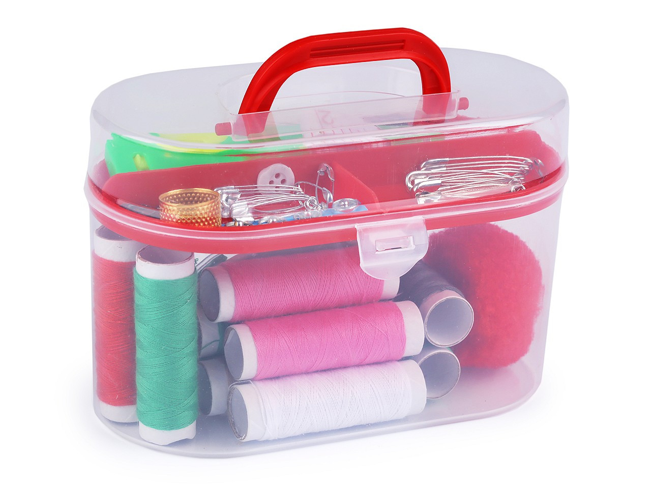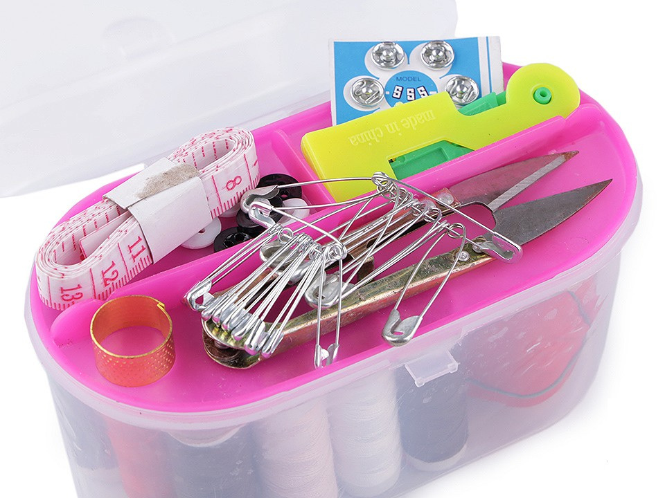 Sada na šití v plastovém boxu je velmi praktická. Obsahuje všechny základní věci, které potřebujete k šití nebo opravení vašeho oblečení. Box se skládá ze dvou částí - z kufříku a odnímatelného patra uvnitř.