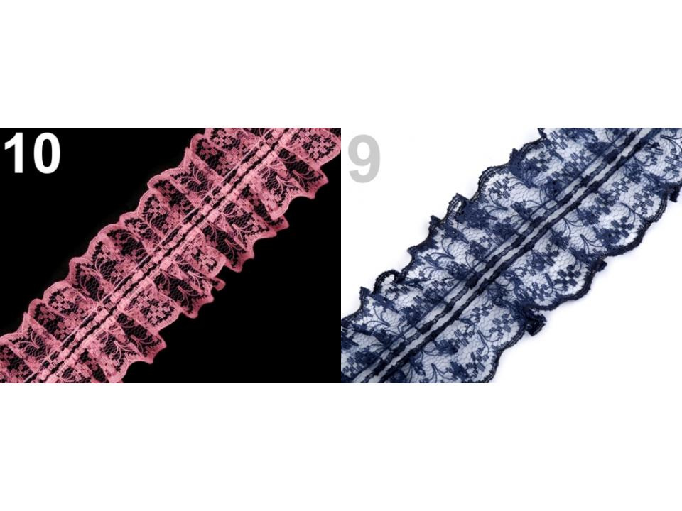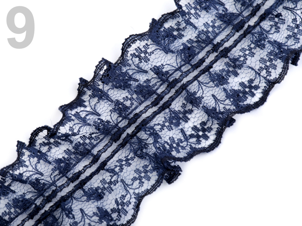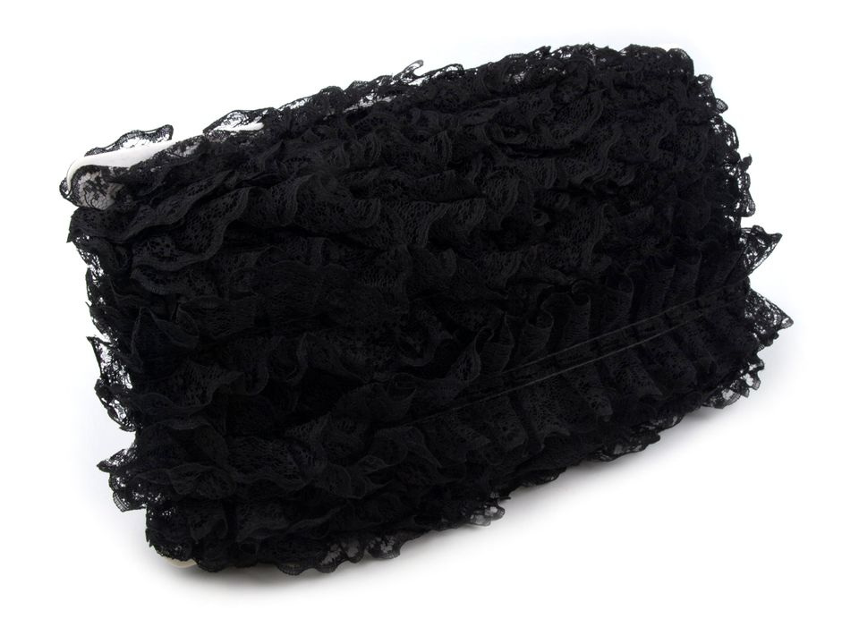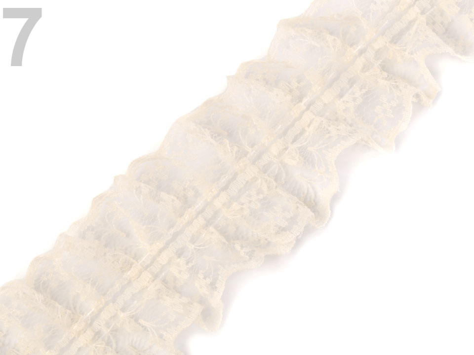 Syntetickou krajku zdobí po stranách jemné volánky. Je pevná, není pružná.