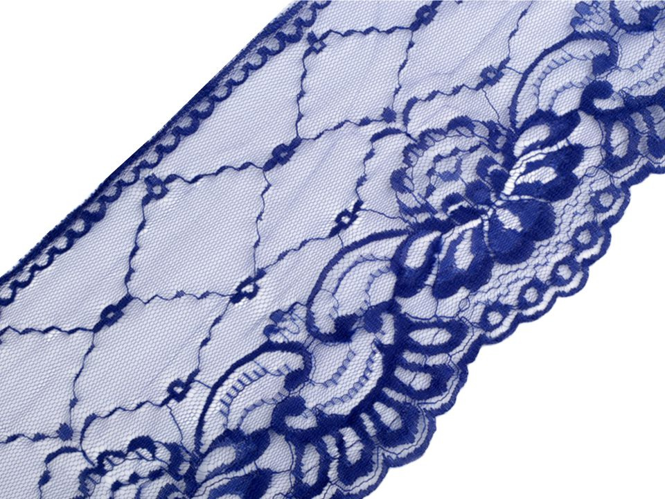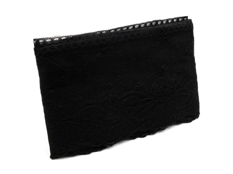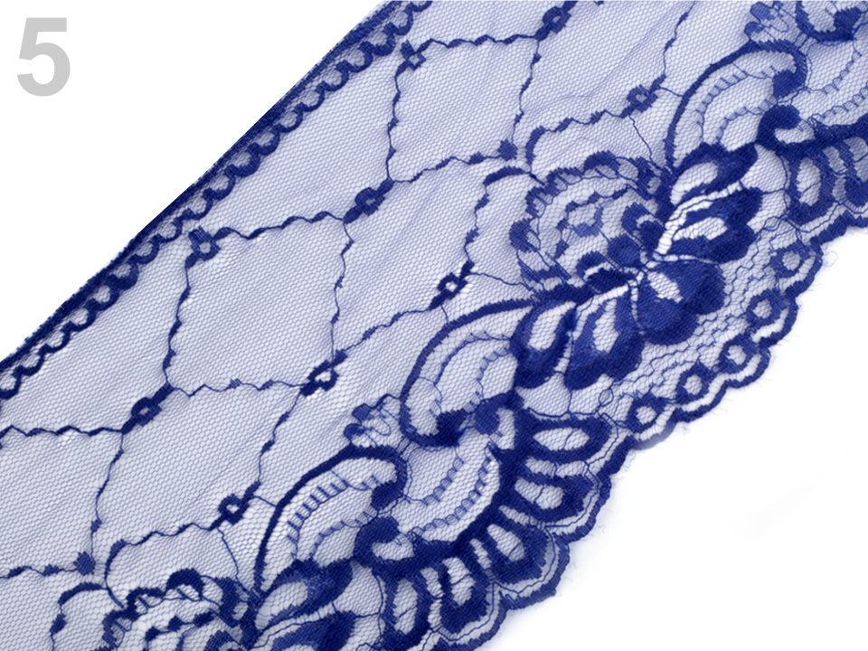 Syntetickou krajku zdobí motivy velkých květů. Na spodní straně je zakončena obloučky. Krajka je pevná, není pružná.