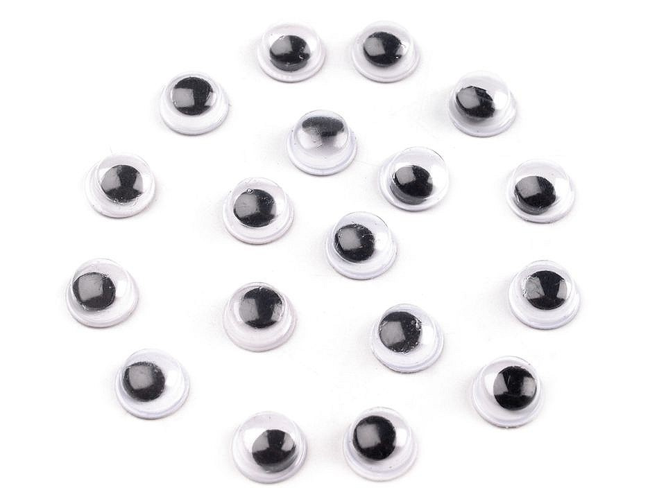 Plastové oči dodají opravdový výraz postavičkám lidí, zvířat, bájným tvorům i ufonům. Záleží jen na vaší fantazii, kam je nalepíte. Jejich velikost je malá, najdou široké uplatnění při tvorbě originálních přání technikou scrapbooking.