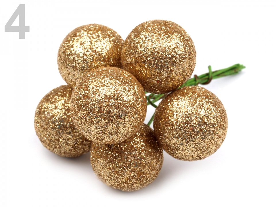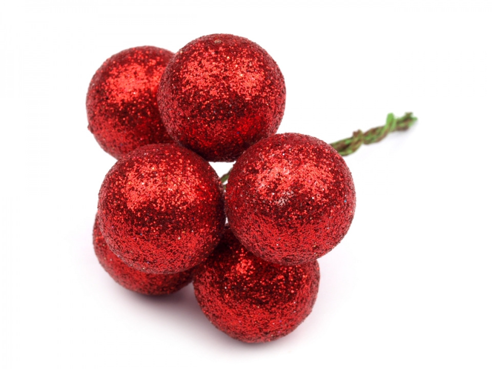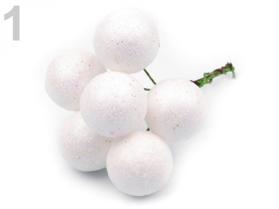 Plastová dekorace v podobě bobulí je vhodná při různých aranžovacích technikách. Povrch bobulí je ozdoben třpytivými glitry, které jim dodávají nádech luxusu.