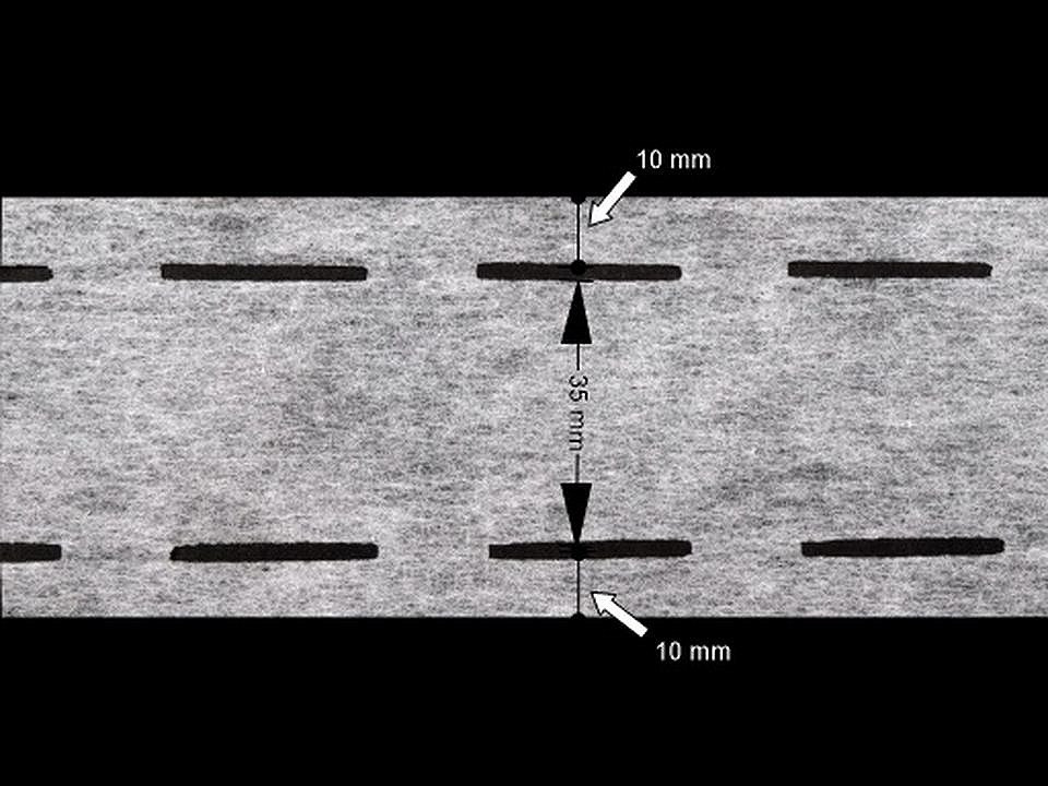 Dírky slouží jako vodítko, přes ně se pásek všívá. Rozměry 10-35-10 znamenají rozměry v mm od jednotlivé perforace k druhé.