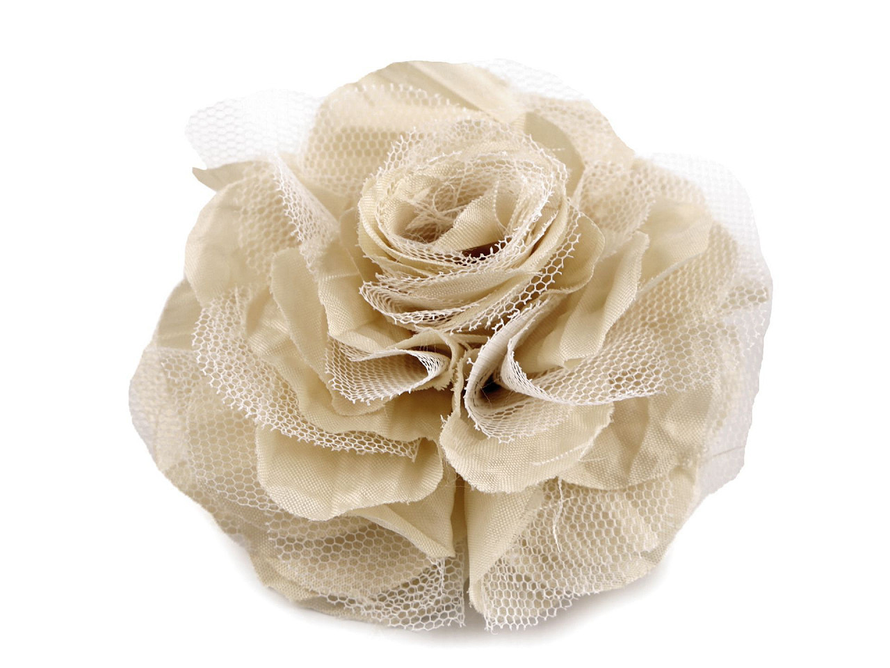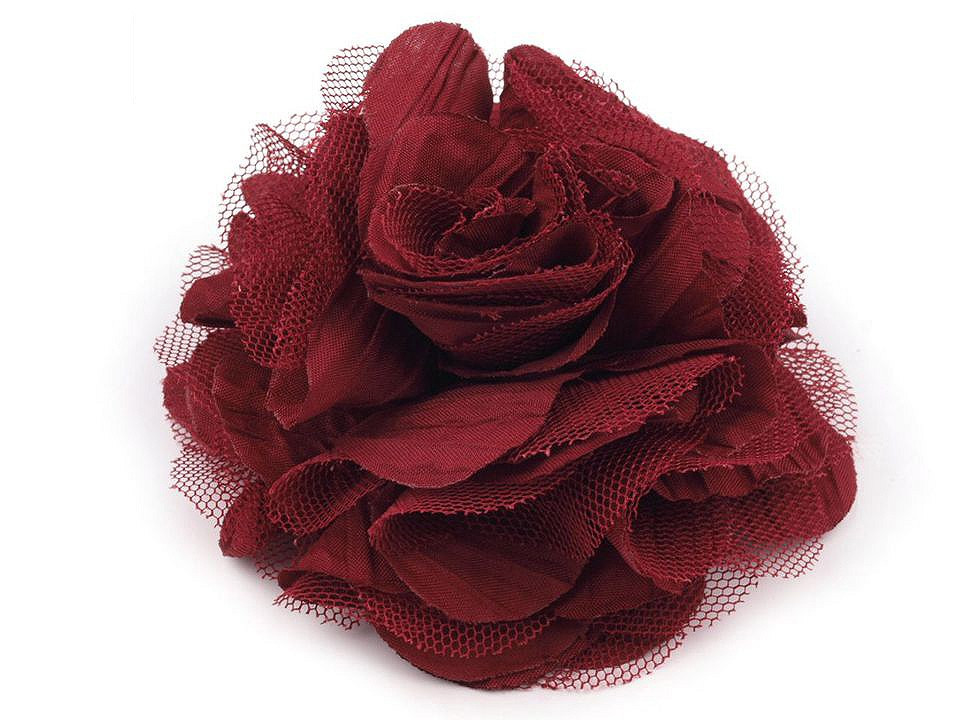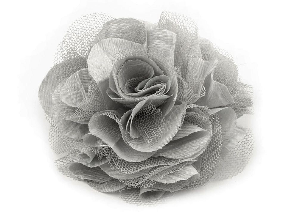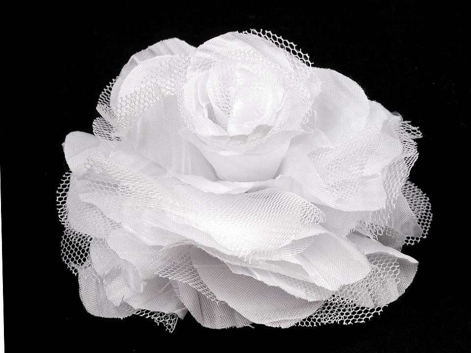 Brož ve tvaru růže je jemně nadýchaná a vyrobena z polyesteru. Ve spodní části má spínací špendlík a klips, takže ji můžete připevnit jak na oděv, tak do vlasů.