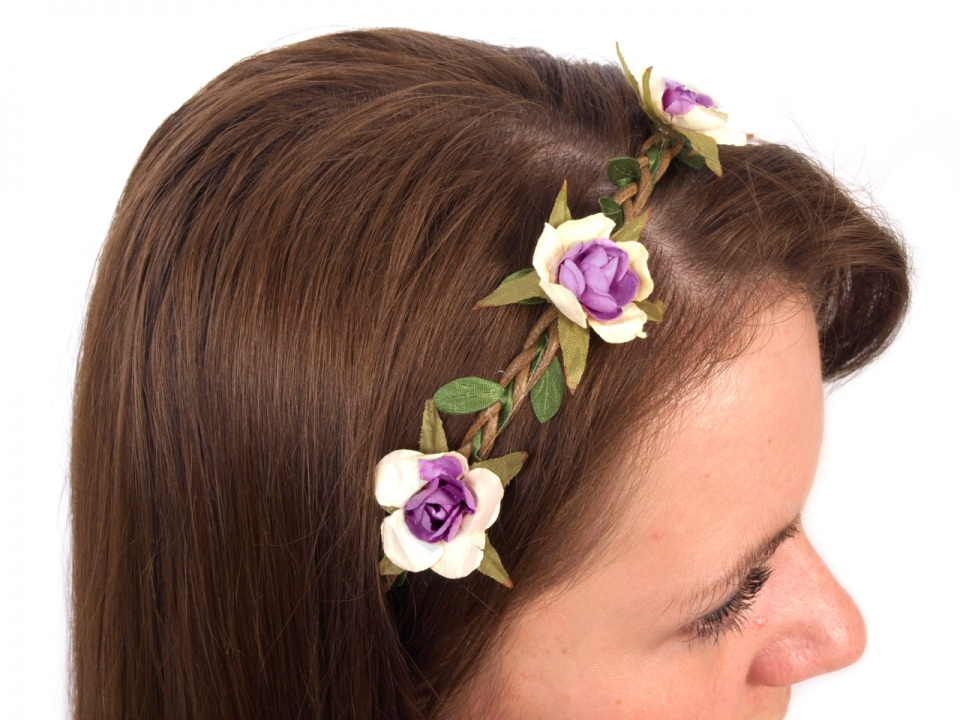 Na spleteném copánku jsou pevně přilepené textilní květy. Drobné lístky jsou vpletené dovnitř copánku. Zadní část tvoří pružná guma široká 0,7 cm. Čelenka pevně drží a nepadá, je velice příjemná na nošení.