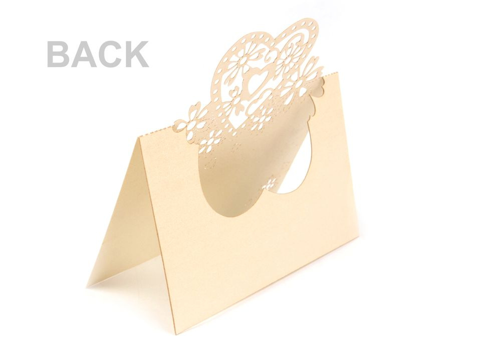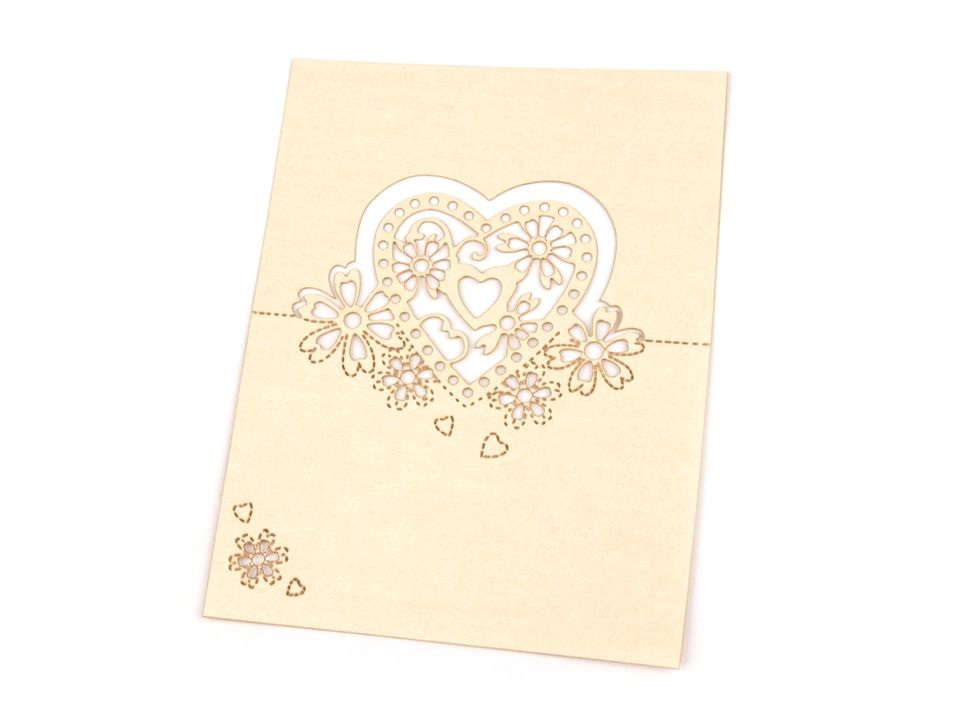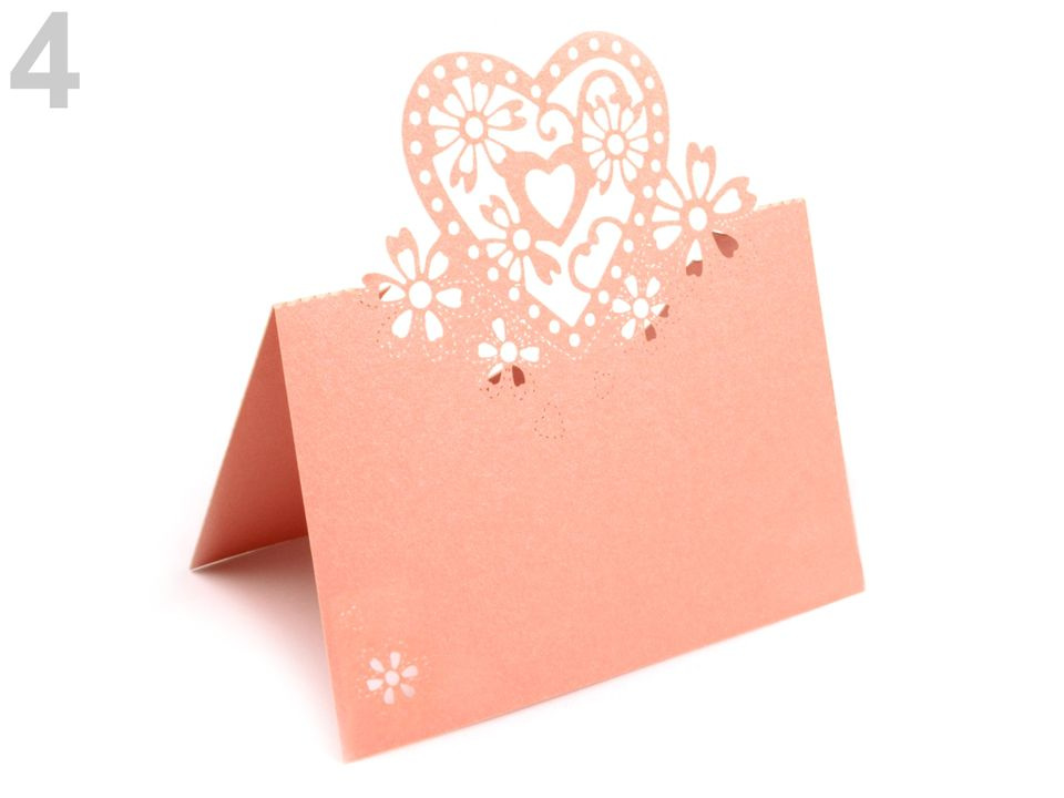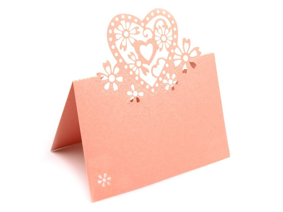 Romantickou jmenovku s motivem srdce oceníte nejen jako praktickou dekoraci na svatební tabuli, ale také při různých akcích jako jsou narozeniny nebo párty. Jmenovka je rozevírací (vhodná spíše na ubrus) a vyrobená z perleťového papíru. Motiv a okraje jsou vyřezávané laserem, díky tomu jsou krásně začištěné.