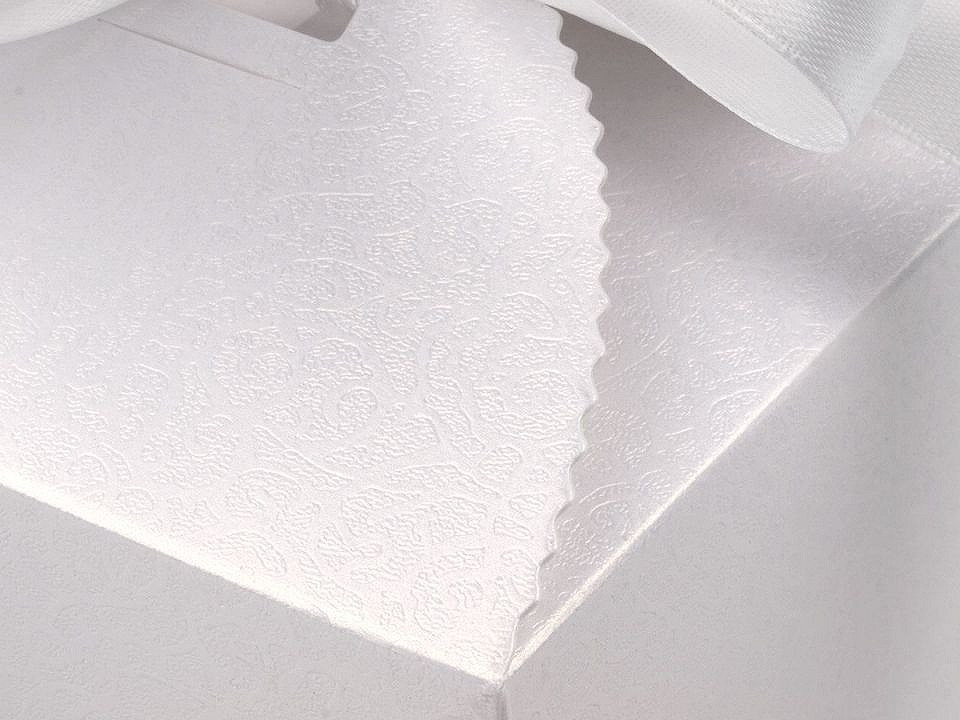 Luxusní papírová krabička je vyrobená z perleťového papíru. Její povrch zdobí jemný reliéf. V horní části jsou vyseknuté otvory, kterými se provleče stuha na zavázání.
