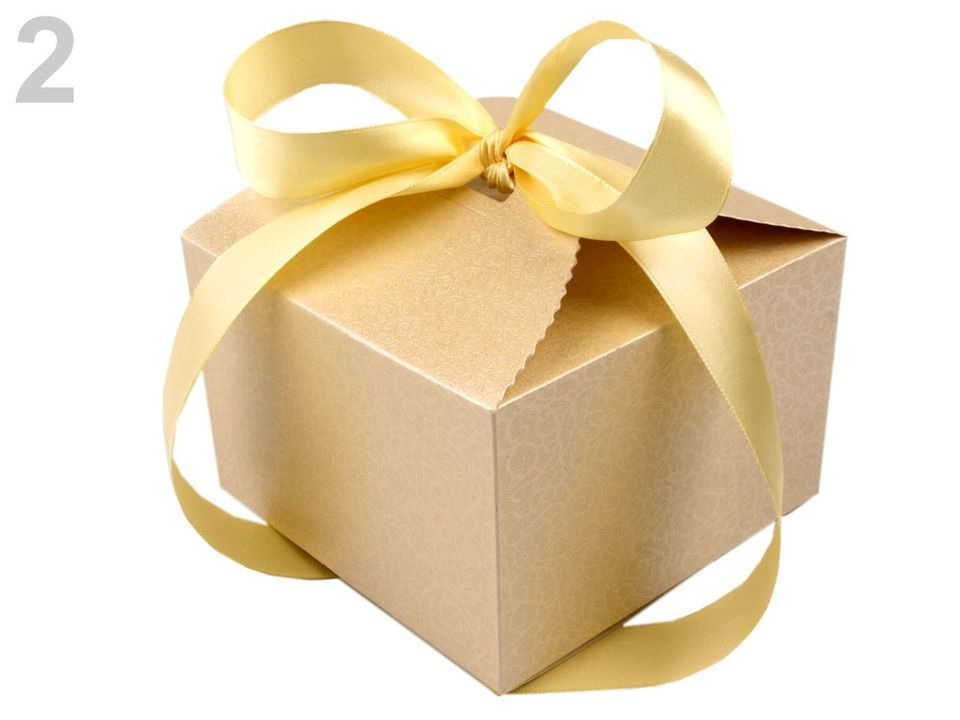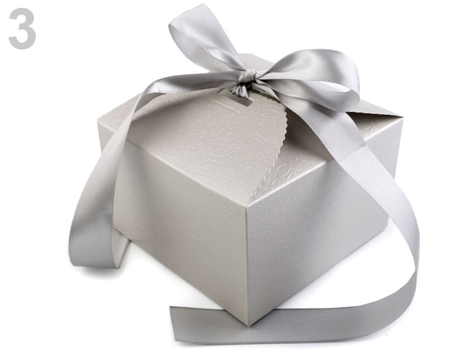 Krabičku dodáváme v rozloženém stavu (23,3 x 25 cm). Složíte si ji jednoduše podle vyznačených ohýbacích krajů. Součástí balení je saténová stuha.