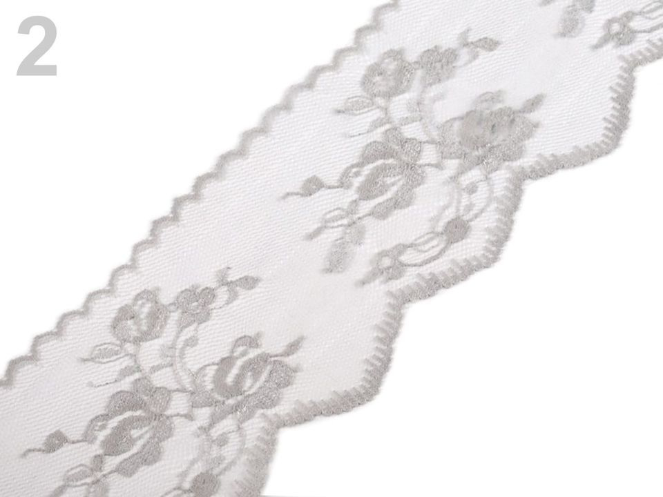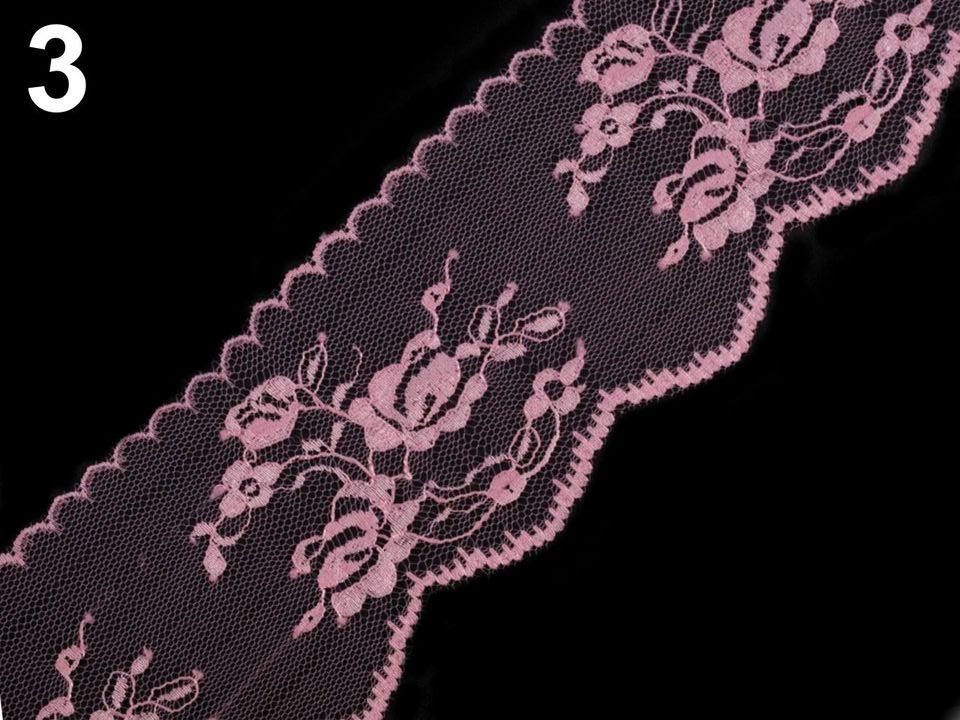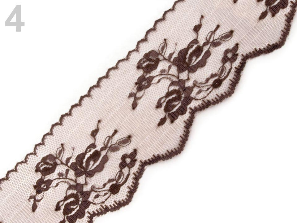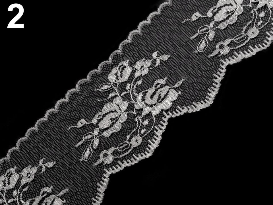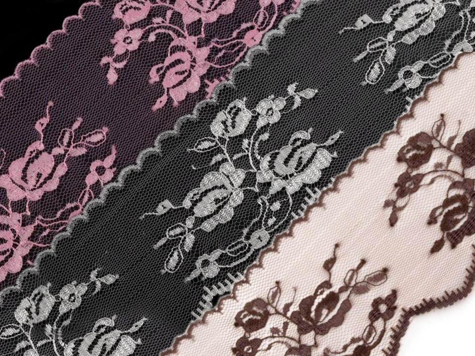 Romantickou krajku zdobí jemné motivy květů. Na spodní straně je zakončena obloučky. Krajka je pevná, není pružná.