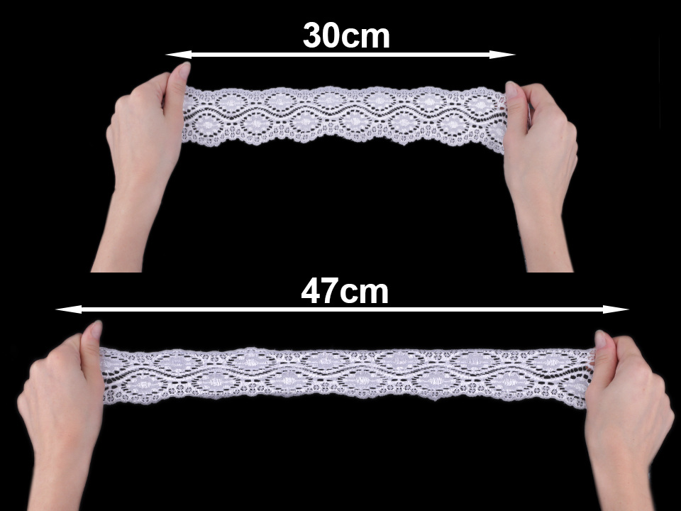 Použití: Krajka je vhodná na ozdobení společenských šatů, dámských halenek, spodního prádla, sukní nebo kostýmků. Můžete ji také našít jako dekoraci na polštáře či ubrusy a vytvořit si tak jedinečný doplněk. Díky vysokému podílu elastanu ji můžete využít na výrobu čelenky do vlasů.