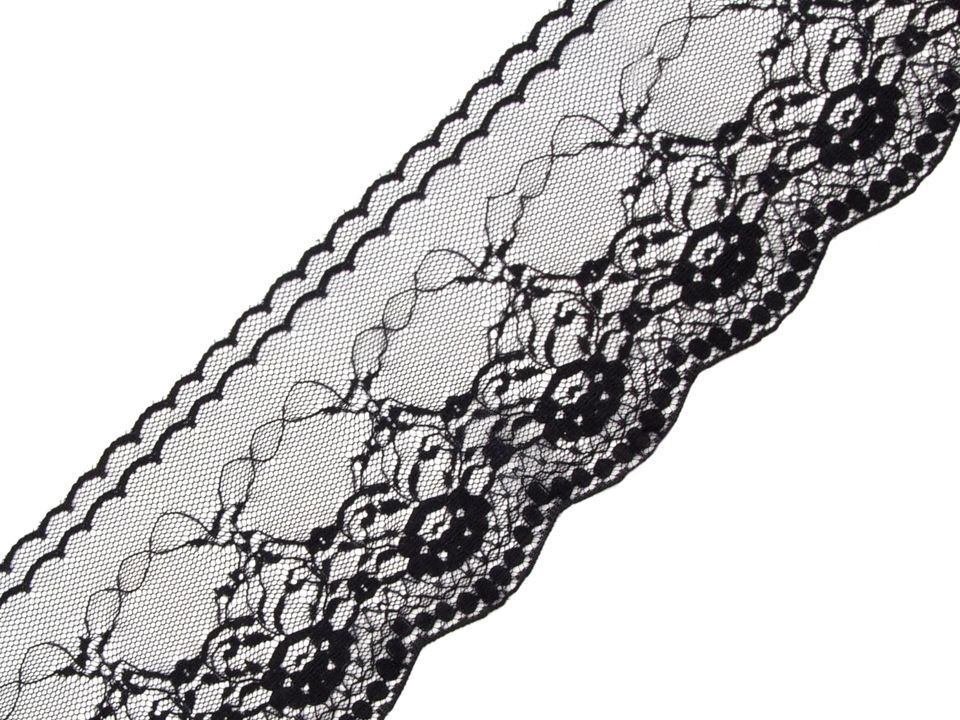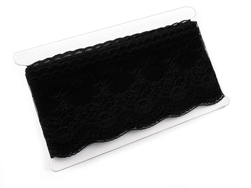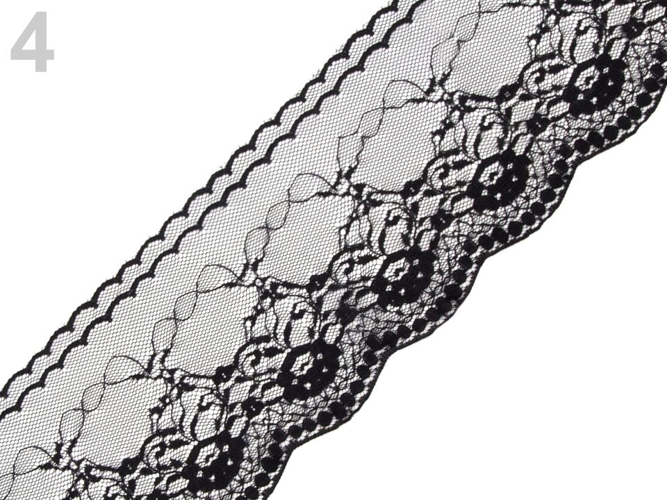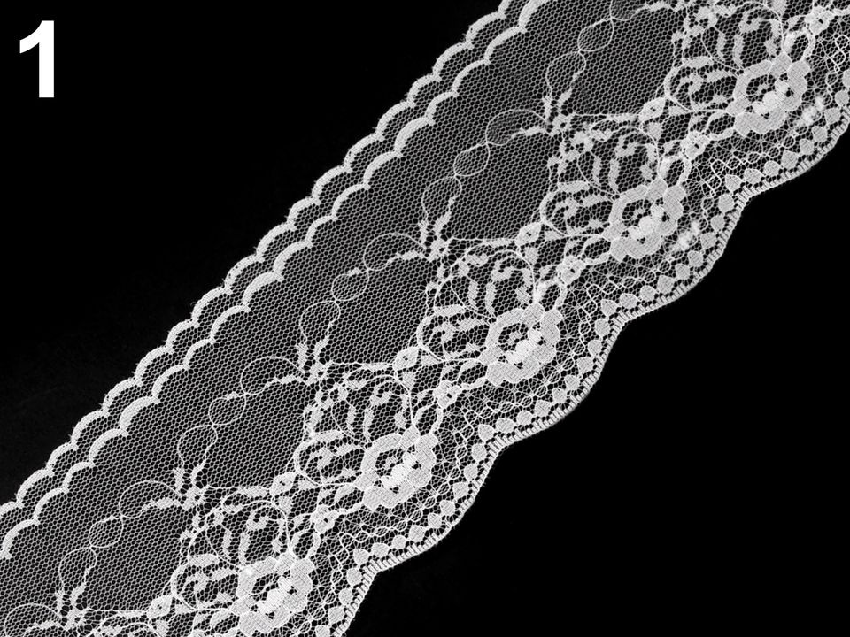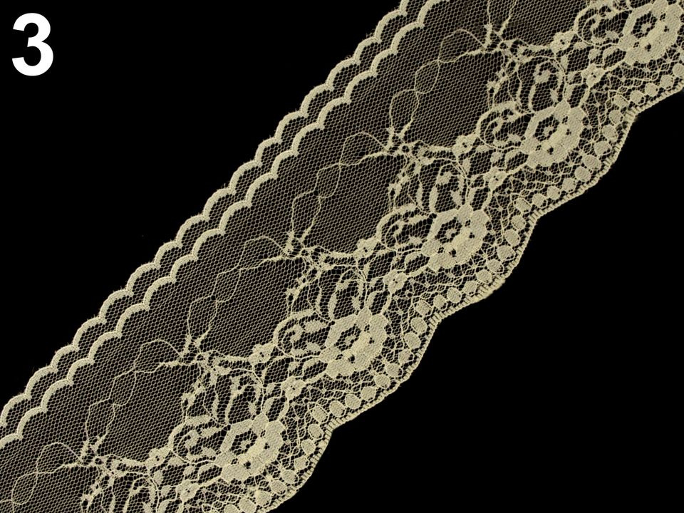 Syntetická krajka s jemnými motivy květů je na spodní straně zakončena obloučky. Krajka je pevná, není pružná.