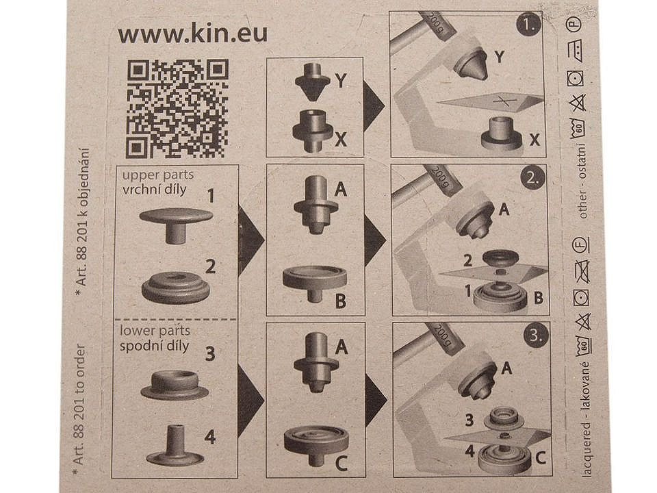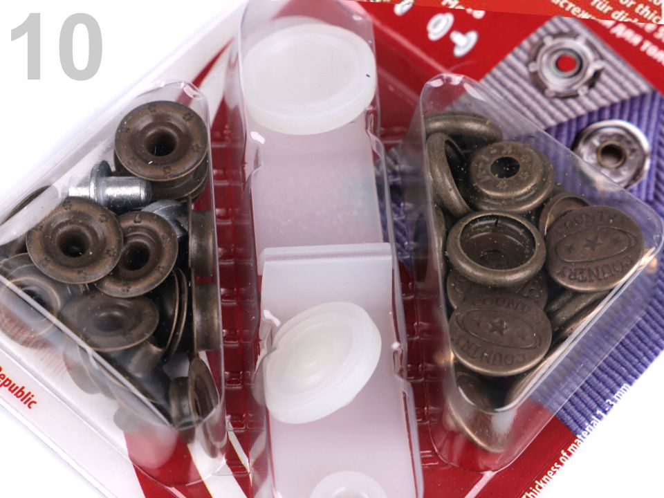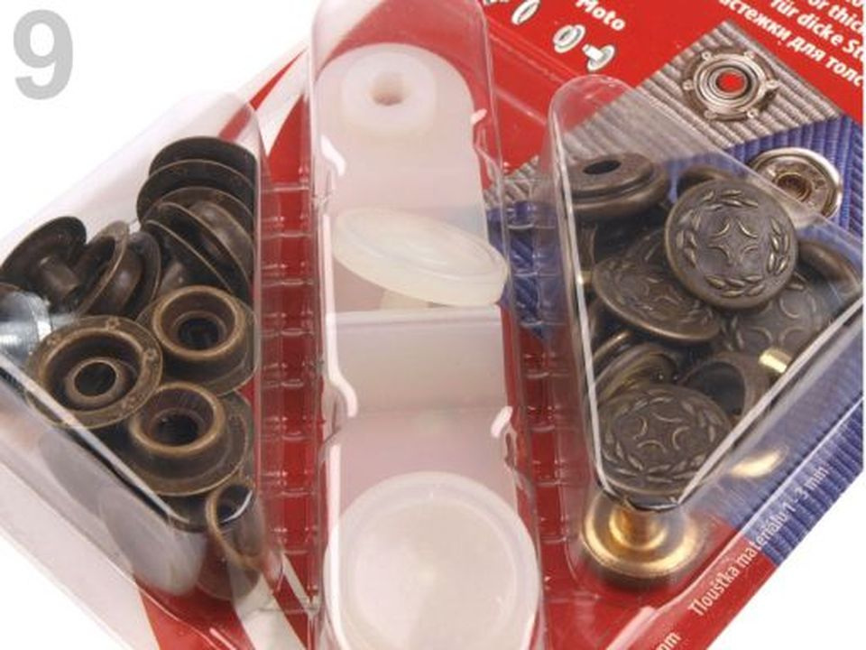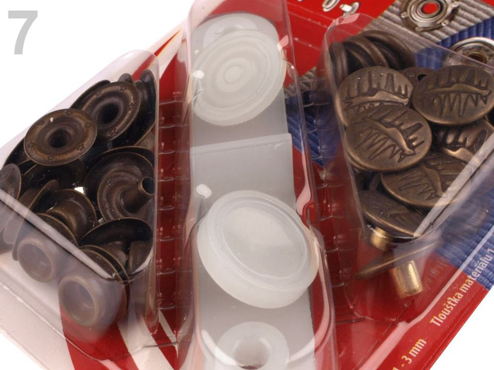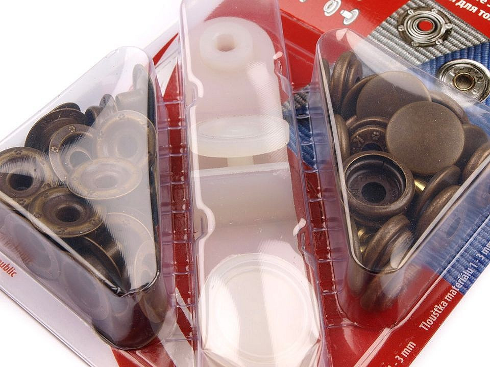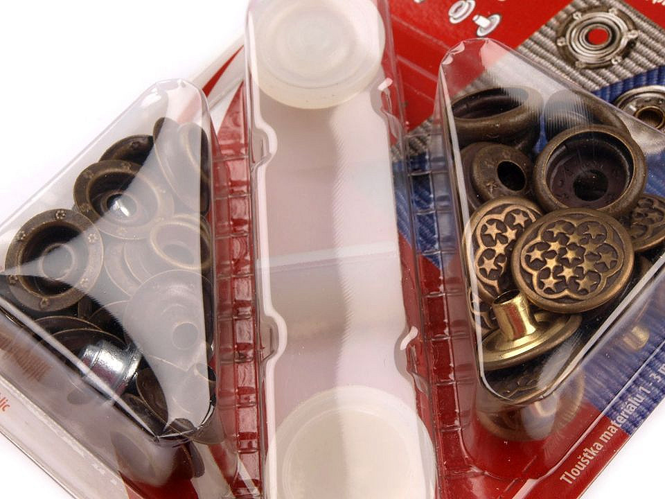 Stiskací knoflíky využijete ke spojování silnějších látek. Nýtování se provádí plastovým mini lisem, který je součástí balení.