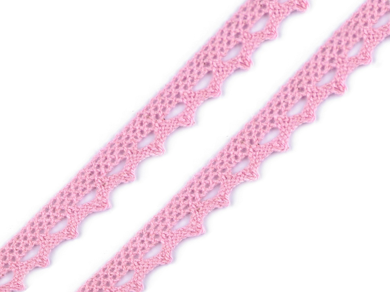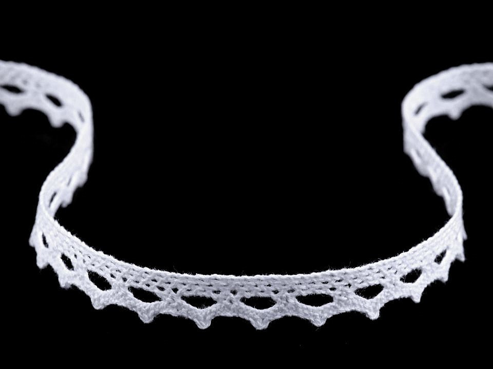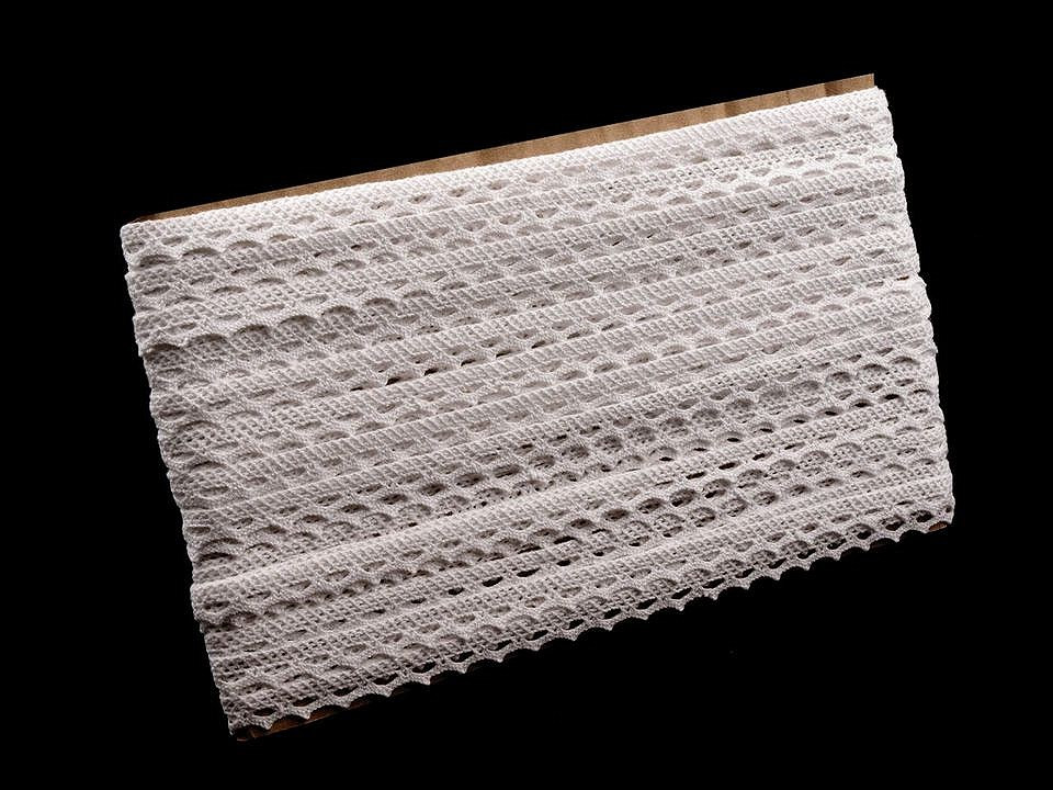 Pevná krajka je vyrobená z bavlny. Zdobí ji jemný paličkovaný vzor s drobnými očky.