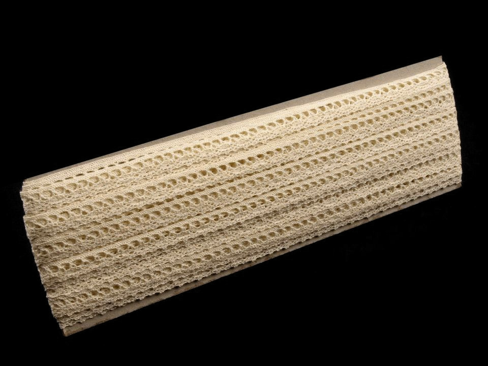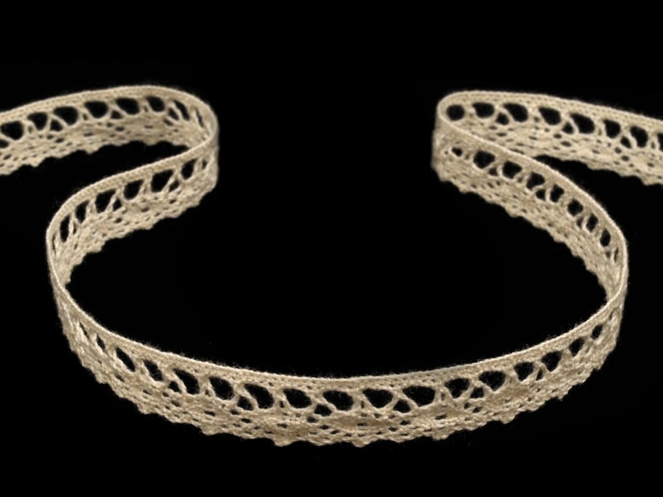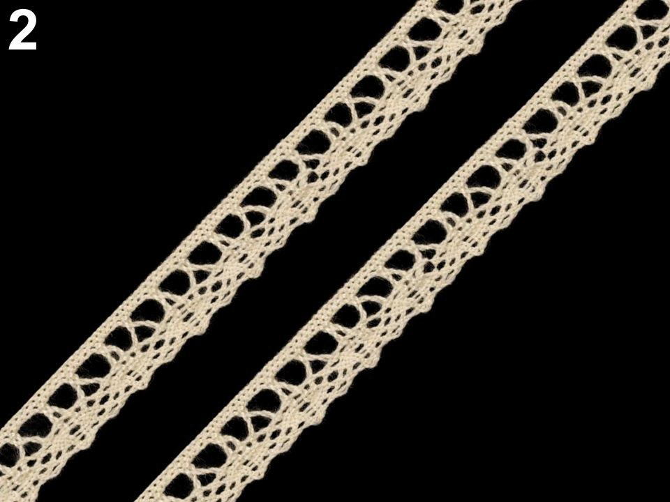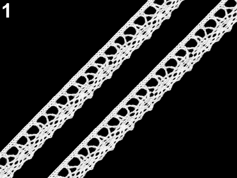 Bavlněná krajka je vytvořena jemným paličkovaným vzorem.