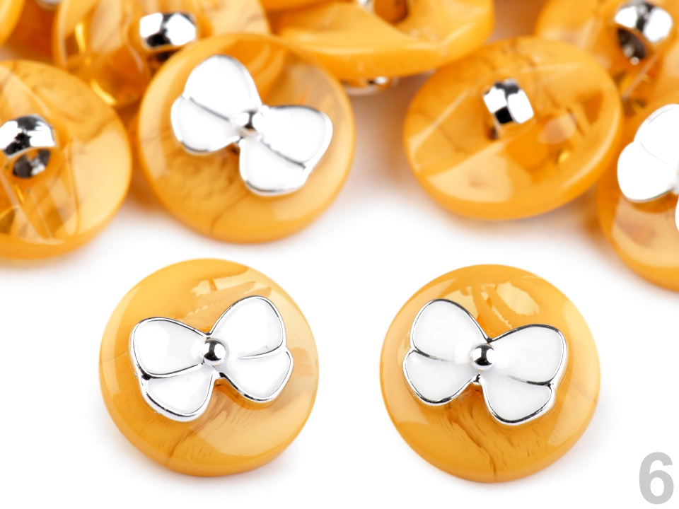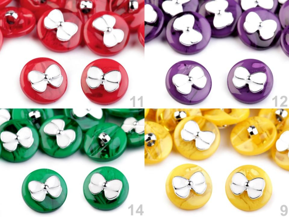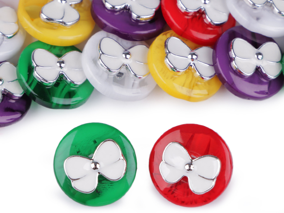 Plastové knoflíky ve veselých barvách zdobí roztomilá mašle. Vyniknou na dívčích halenkách, šatech nebo svetrech. Knoflíky mají spodní přišívání.