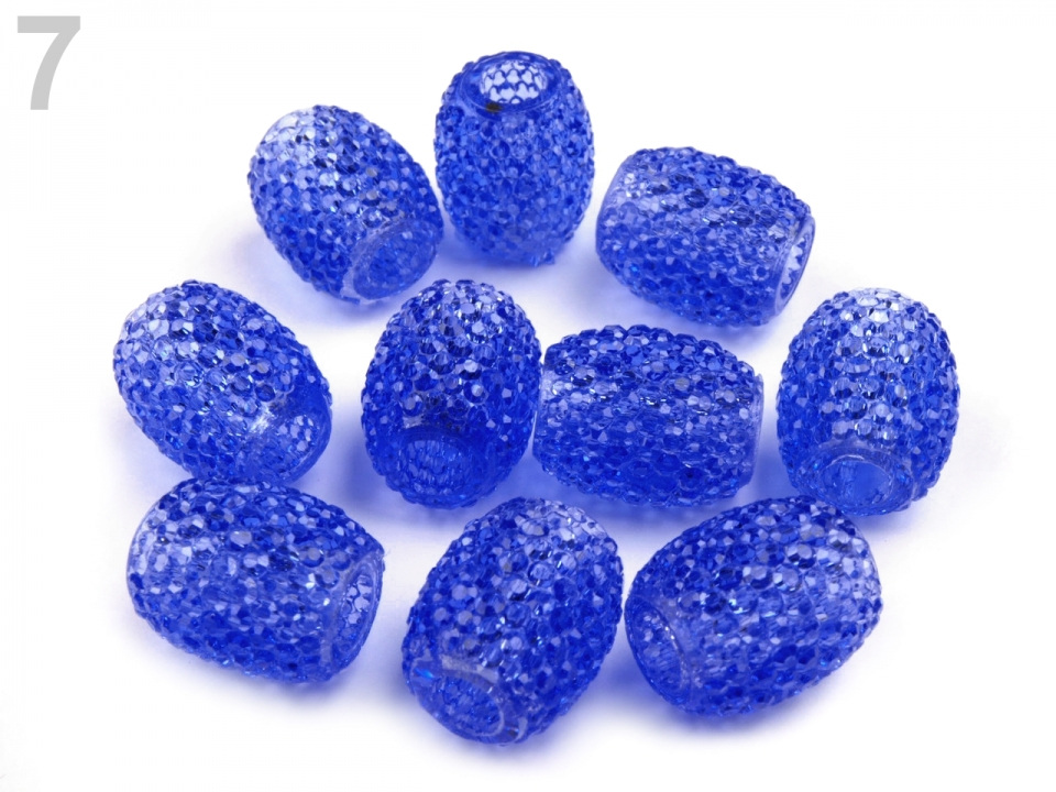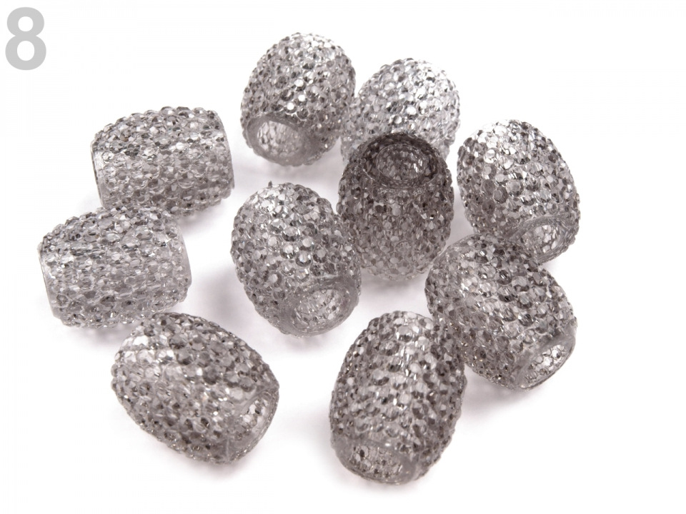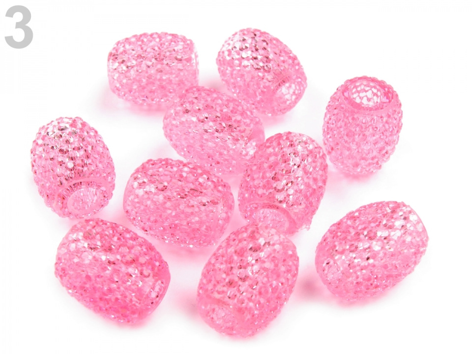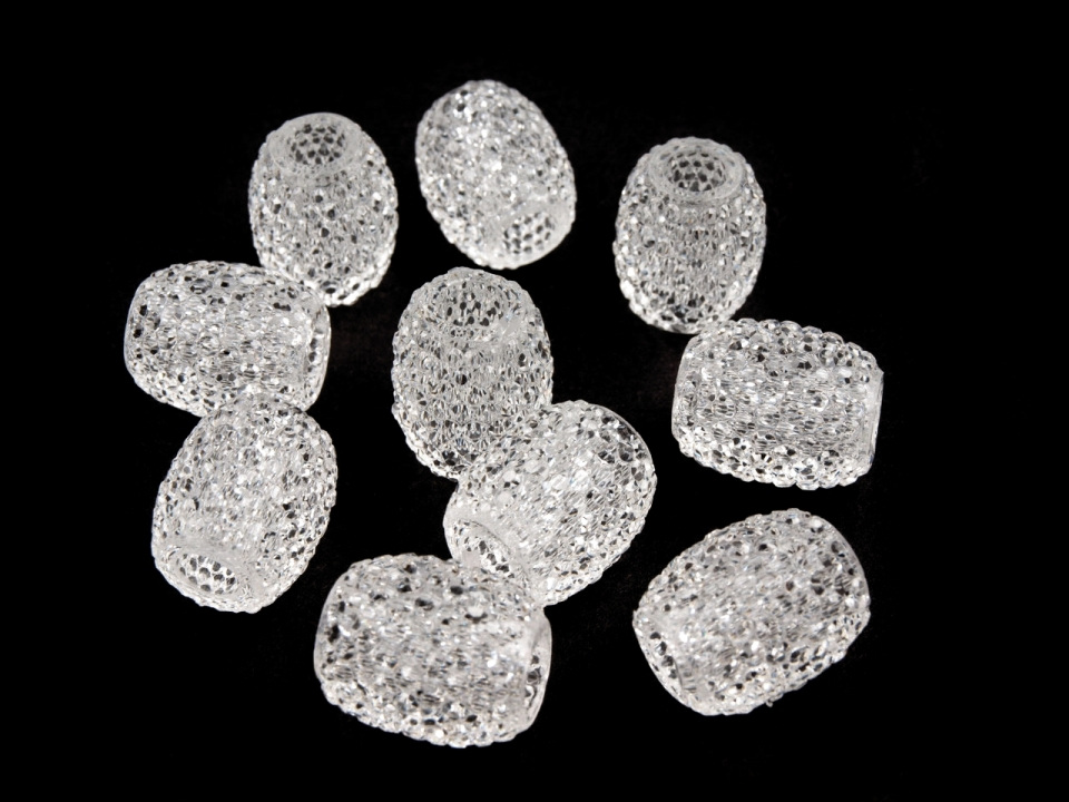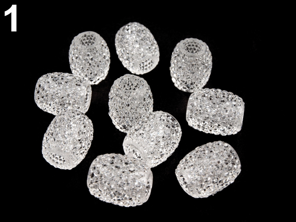Transparentní korálky s velkým průvlekem ve tvaru olivy mají díky drobných plošek výrazný lesk. Jejich velikou výhodou je lehkost použitého materiálu.