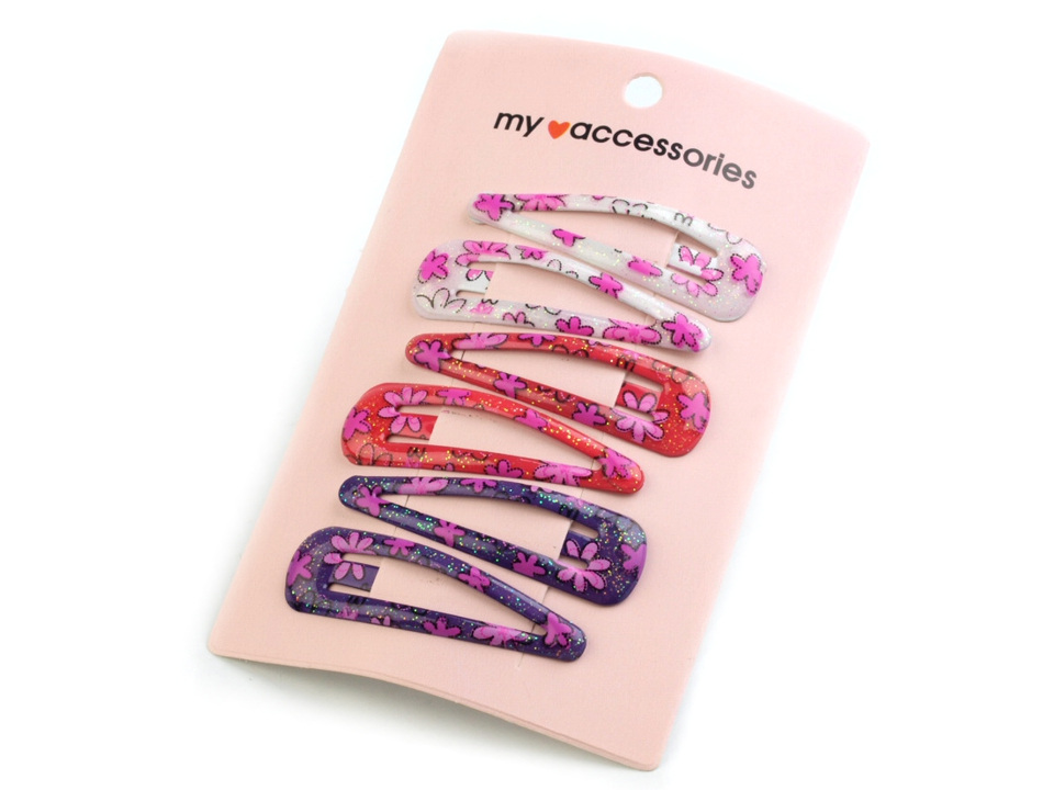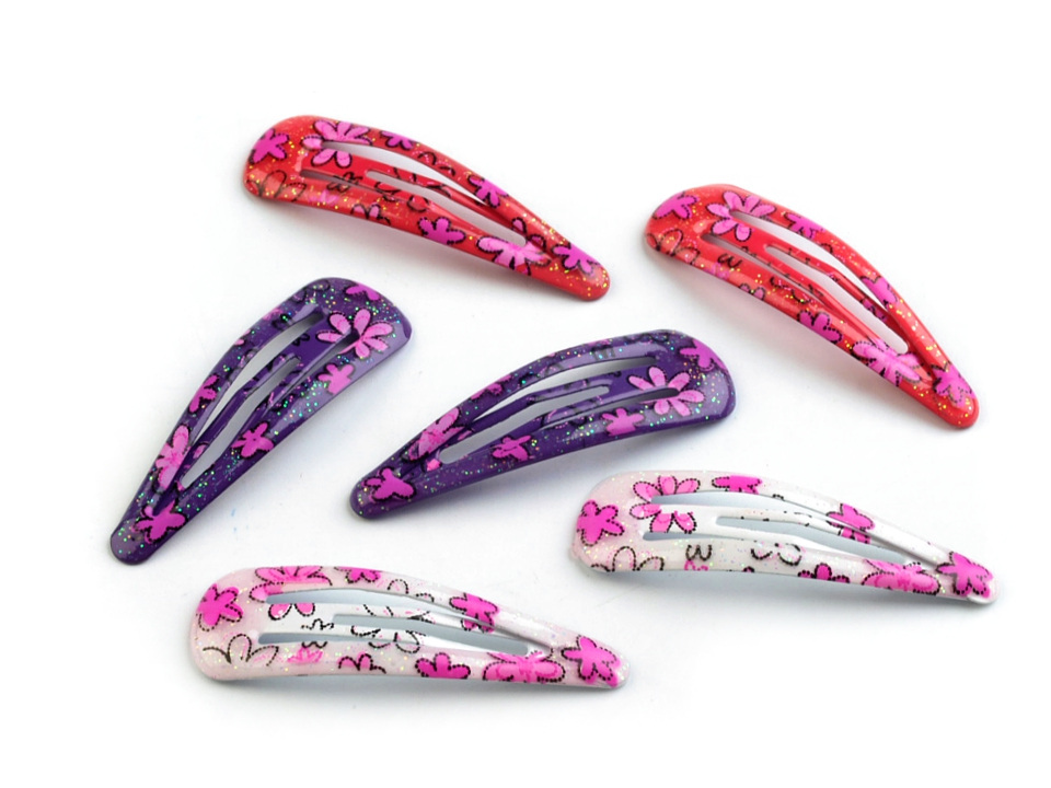 Má vysoký lesk. Výhodou těchto pružných sponek je jejich kvalita i pohodlné nošení. Sponky ve vlasech netlačí ani nesjíždějí. Potisk je z barvy, která vypadá jako smalt.