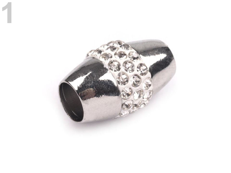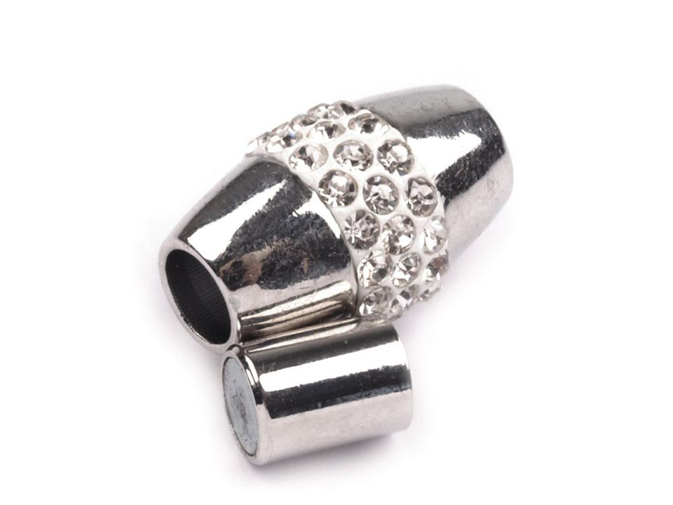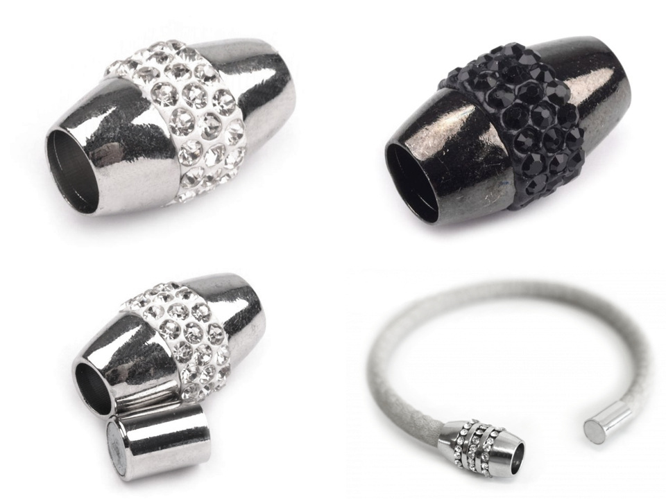 Třpytivé magnetické zapínání dodá vašim náhrdelníkům a náramkům luxusní vzhled. Je vlepovací, vhodnými materiály k použití jsou především šňůrky, modistické dutinky nebo jiný textilní materiál.