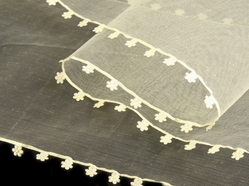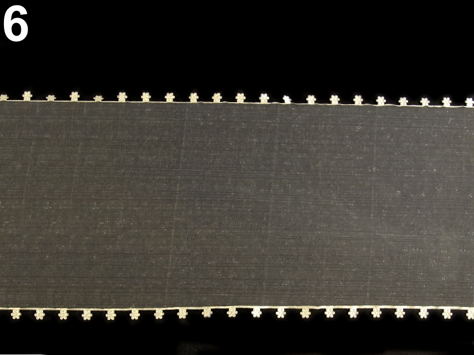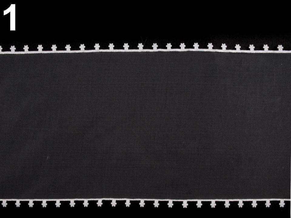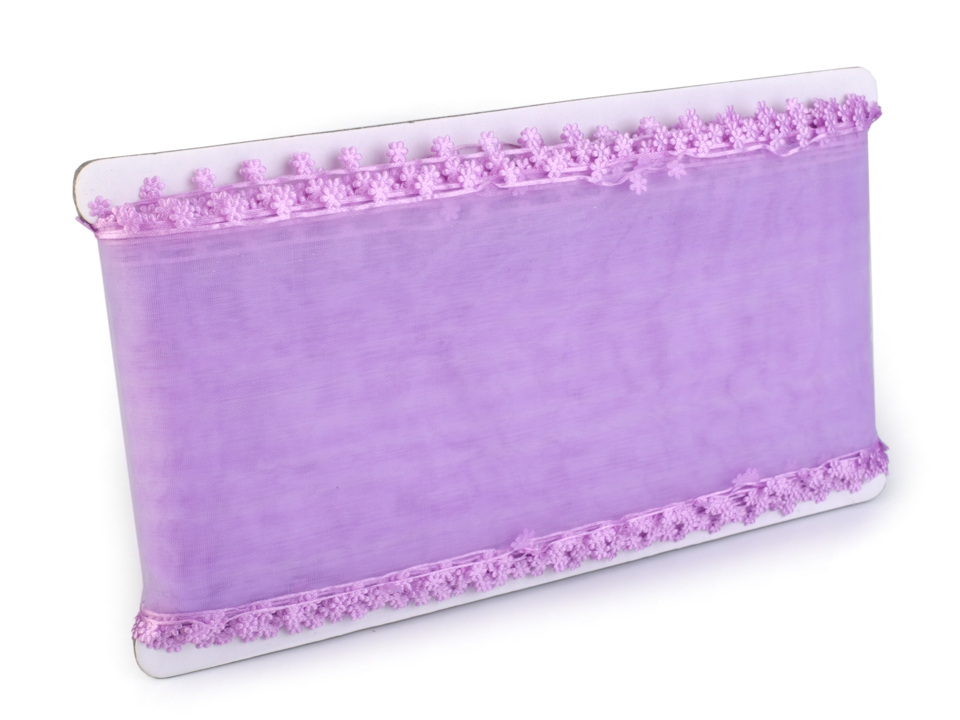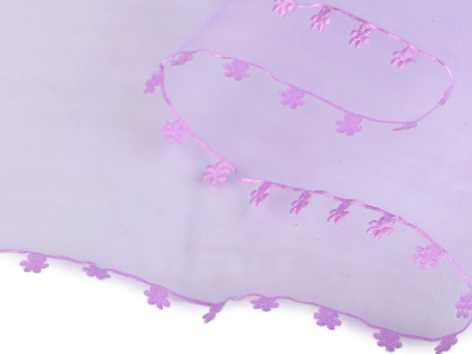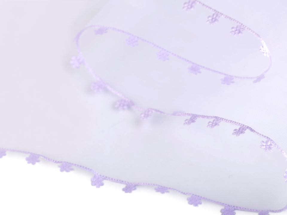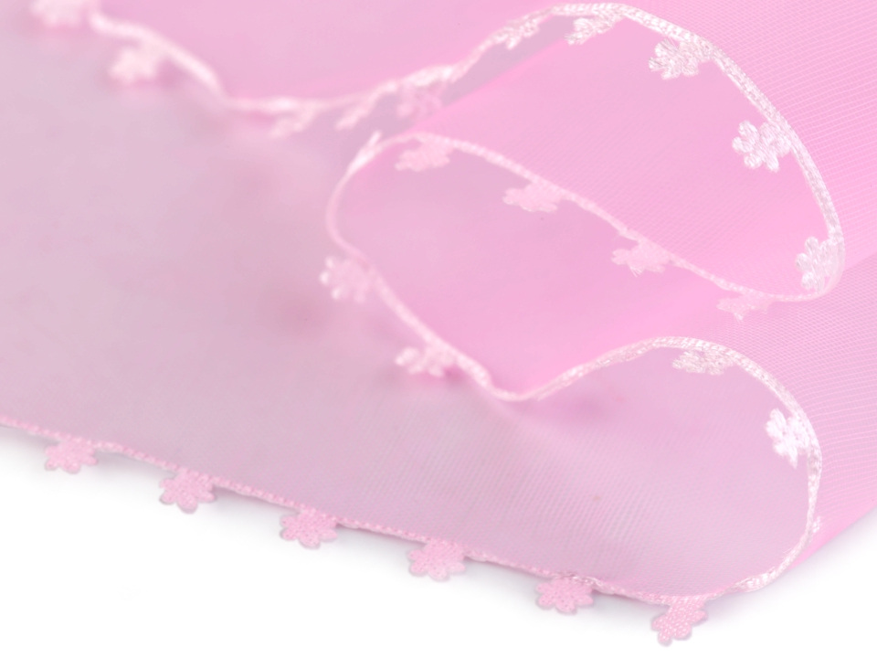 Monofilovou stuhu zdobí po stranách drobné textilní květy.