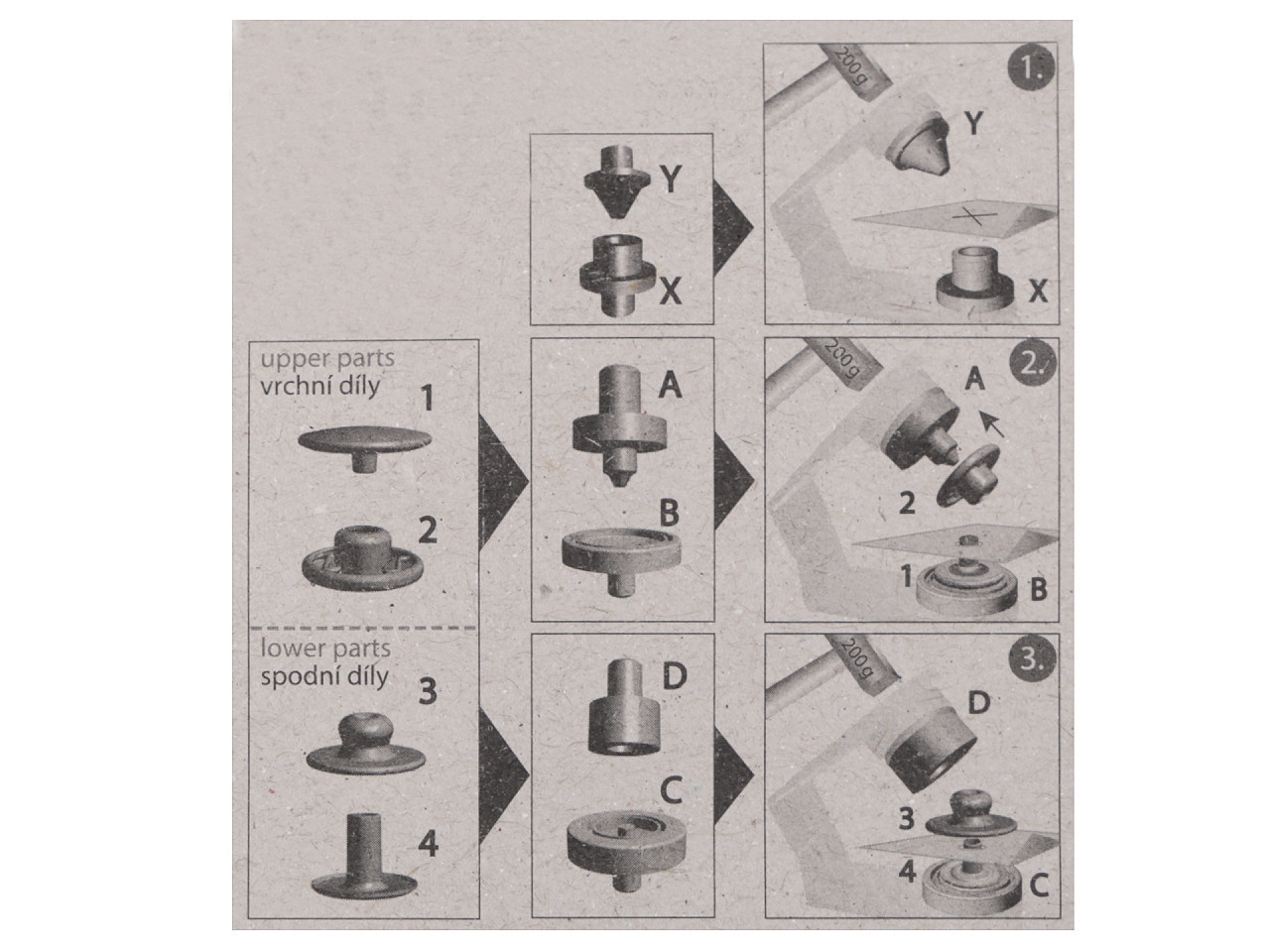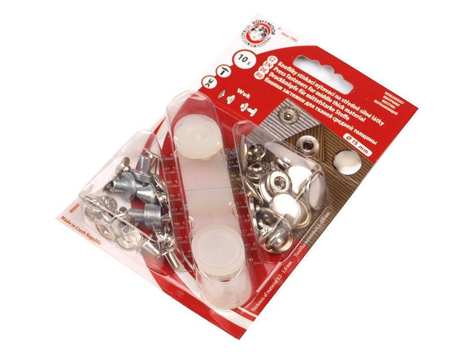 Stiskací knoflíky s označením "wuk" jsou určeny ke spojování středně silných látek. Nýtování se provádí plastovým mini lisem, který je součástí balení. Knoflíky nereziví.