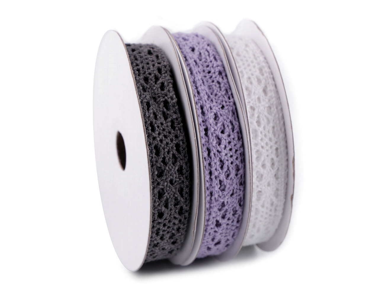V jedné sadě jsou 3 cívky a na každé z nich je krajka s návinem 5 m. Celkem je tedy v jednom balení 15 m.
