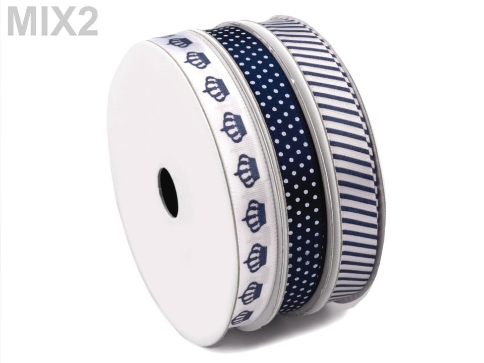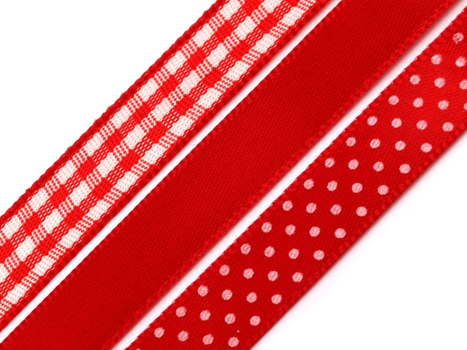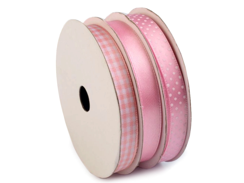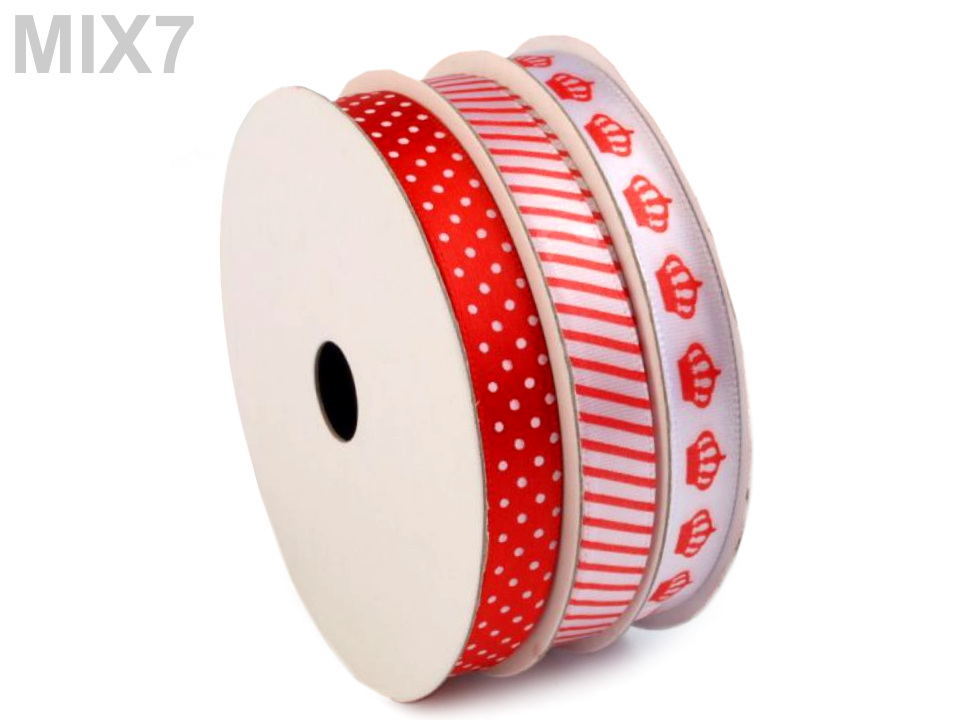 Atlasové stuhy jsou namixované v barvách a vzorech, které k sobě ladí. Najdete zde stuhy s puntíky, proužky a potisky. Vzory na stuhách jsou jednostranné.