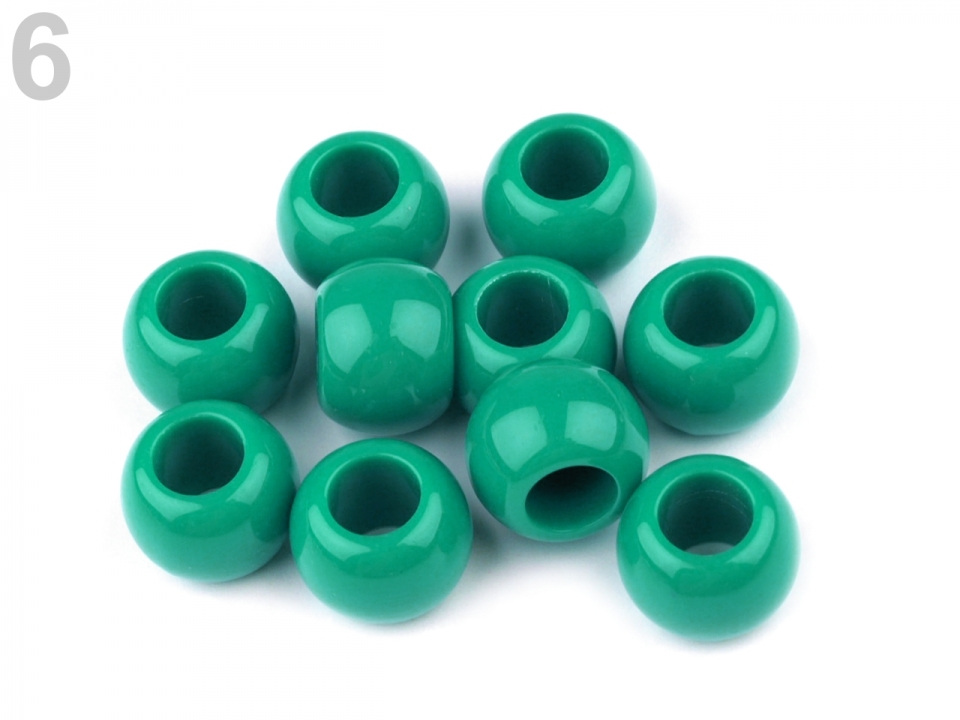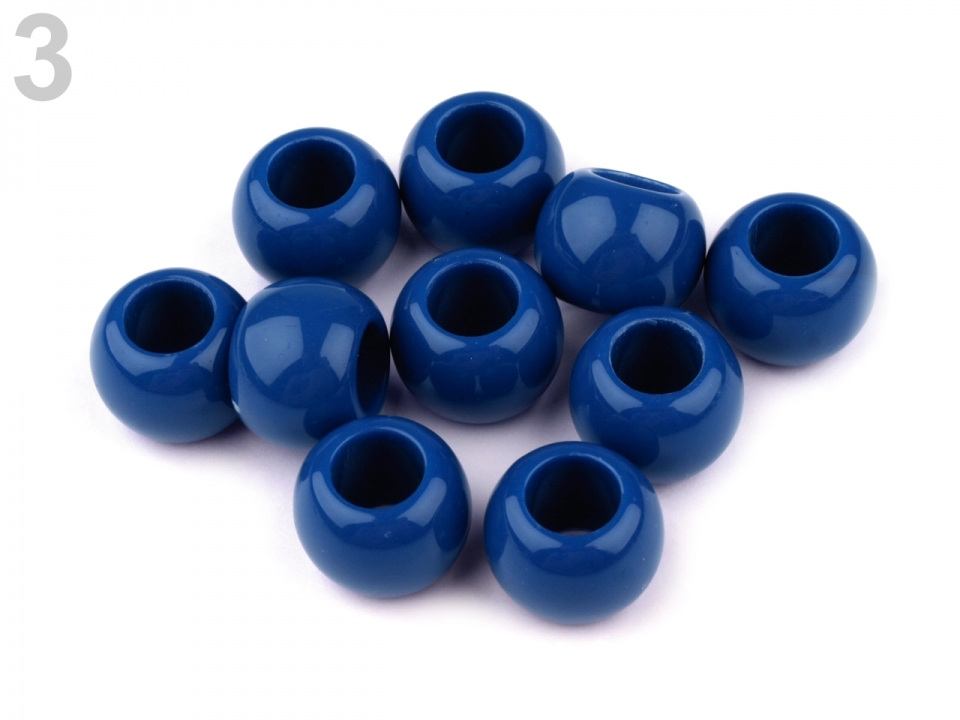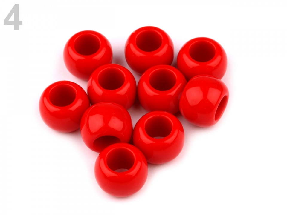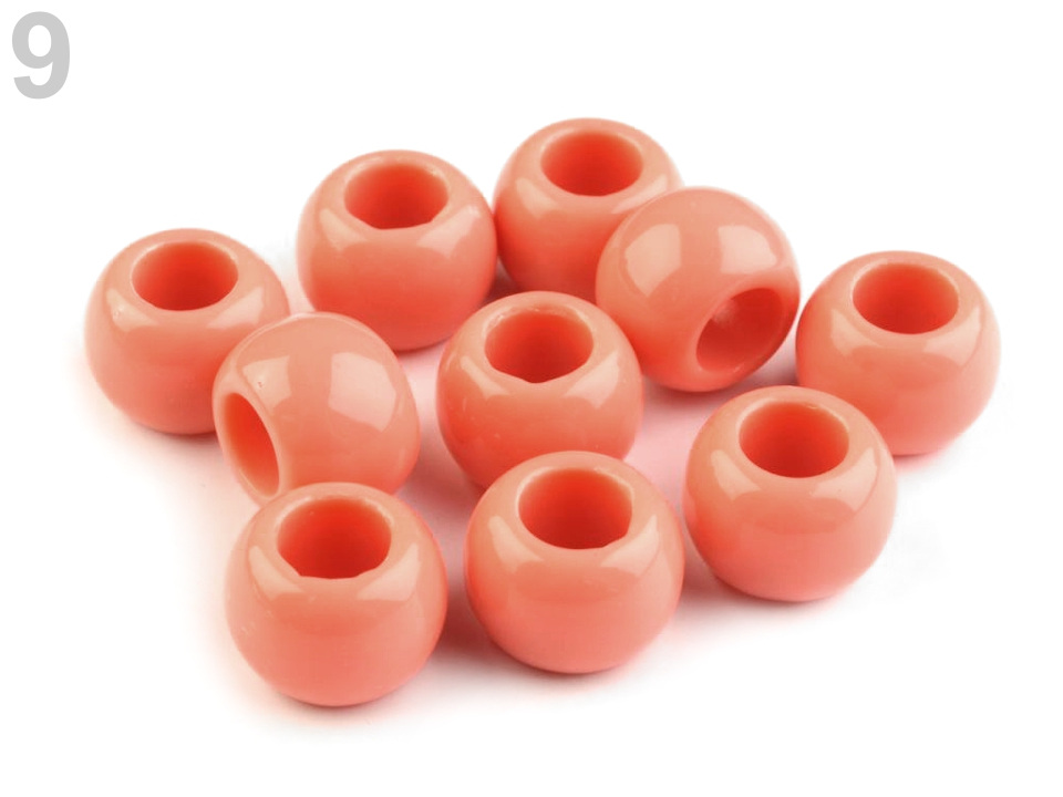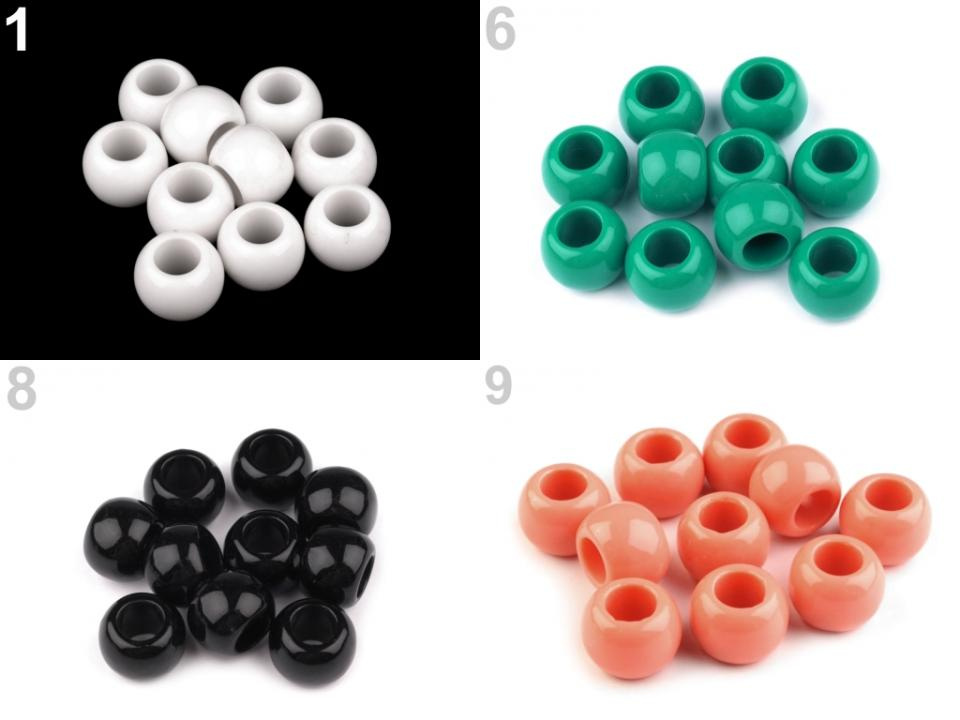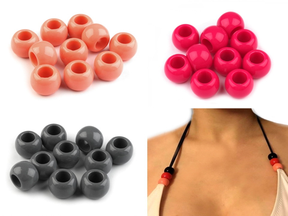 Plastové korálky s velkým průvlekem mají pěkný lesk a syté barvy. Jsou velice kvalitní, všude hladké, nemají žádné otřepení nebo viditelné švy. Hodí se do retro šperků.