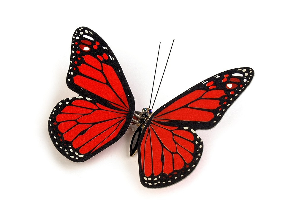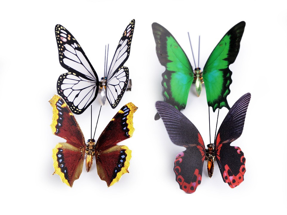 Střed těla je ozdobený plastovými broušenými kamínky, které se třpytí. Díky kovového klipsu se zoubky, který je na spodní straně, je můžete připevnit kamkoliv. Originálně vám oživí každý interiér. Vyniknou na záclonách, závěsech nebo v květinových vazbách a ikebanách.