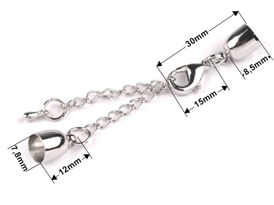 Karabinka bez očka měří 7 x 10 mm, s očkem 7 x 15 mm. Koncovky mají vnitřní Ø7 mm, hloubku 7,5 mm, prodlužovací řetízek je dlouhý 60 mm. Další rozměry najdete na poslední fotografii.