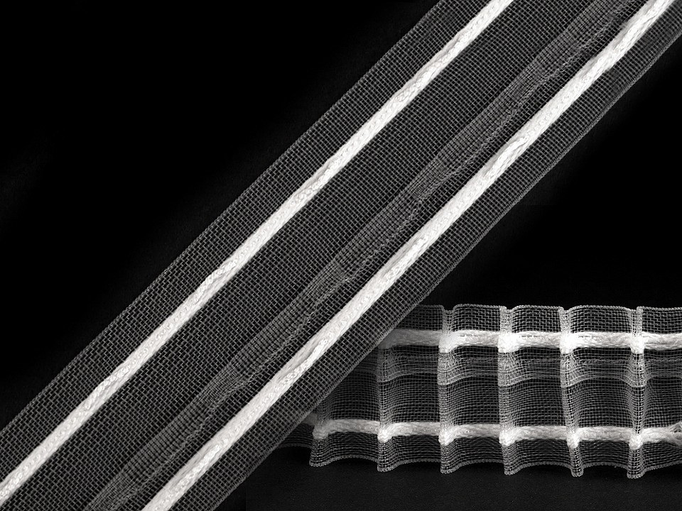 Pevná záclonovka má ze zadní strany 2 šňůrky, za které stačí zatáhnout, aby vznikly pravidelné sklady. Tyto sklady můžete použít k přichycení žabiček a zavěšení. Zaručí rovnoměrné nařasení záclon a závěsů. Díky transparentnímu materiálu je v záclonách velice nenápadná.