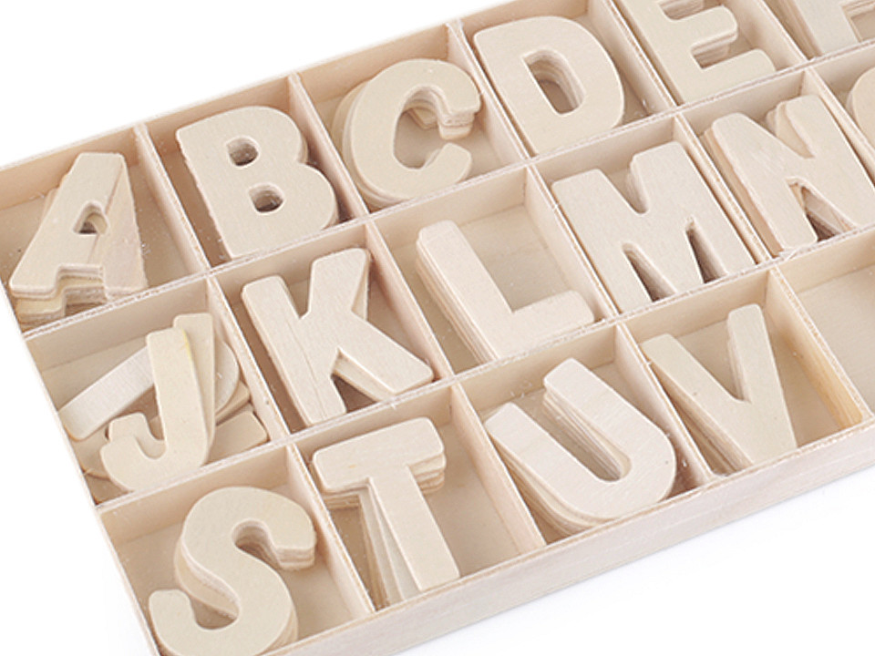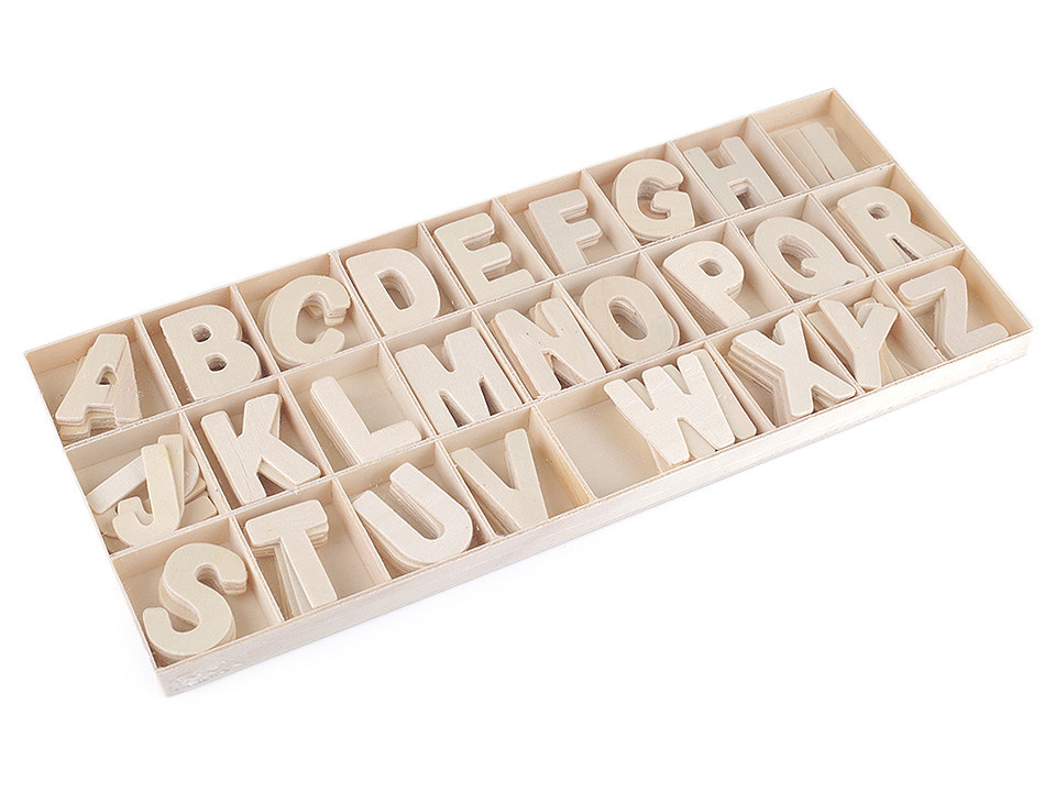 Dřevěná písmena v krabici zobrazují celou abecedu. Je oblíbená maminkami prvňáčků, s úspěchem ji používají jako zábavnou učební pomůcku. Hodí se k nalepení na přání, můžete s nimi ozdobit dveře dětského pokoje apod. Z rubu nemají samolepku, k přichycení můžete použít oboustrannou lepicí pásku nebo tekuté lepidlo.