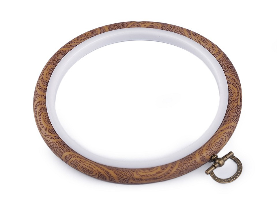 Vyšívací kruh slouží k uchycení látky, na kterou budete vyšívat obrázek. Je vyrobený z pryže, která imituje dřevo, a plastu. Kruh je doplněný kovovým šroubkem, pomocí něhož ho můžete pověsit na stěnu.