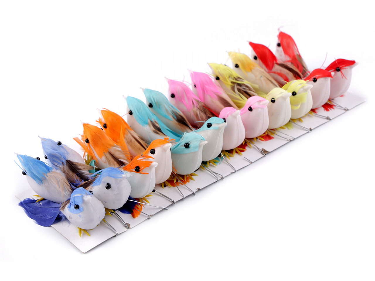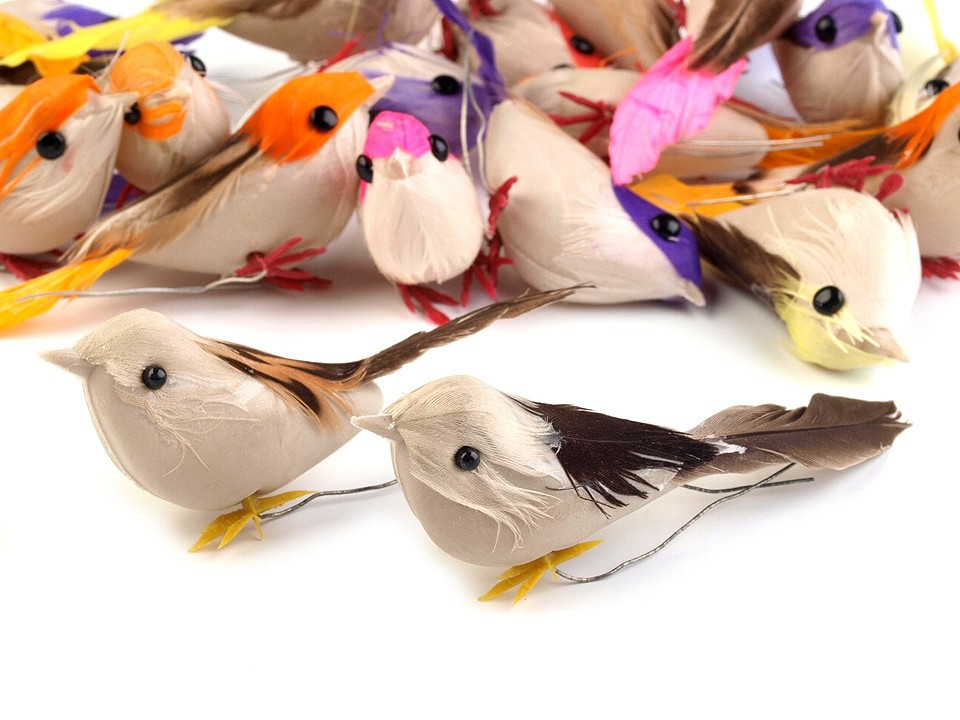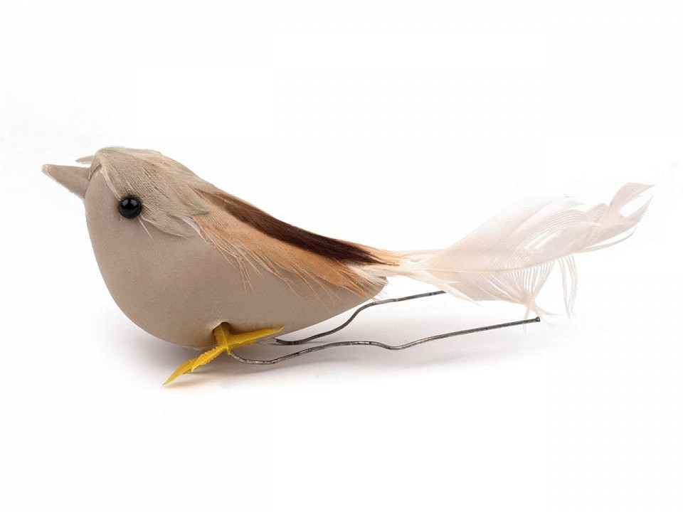 Dekorační ptáček je vyrobený z plastu a jeho tělo pokrývá barevné peří. Na jeho nohách má připevněné dva kovové drátky, díky kterým můžete ptáčka připevnit například na věnec, větvičku, záclonu či ho naaranžovat do květinových vazeb.