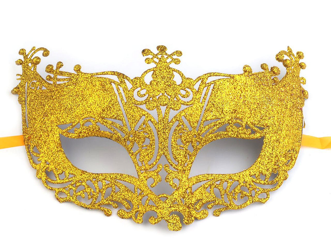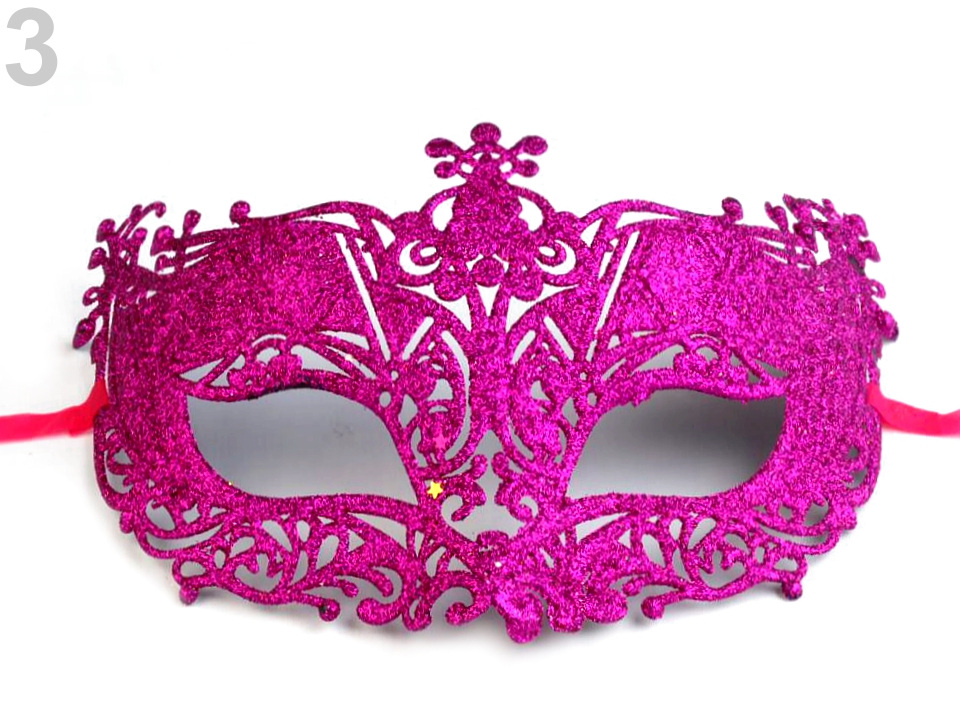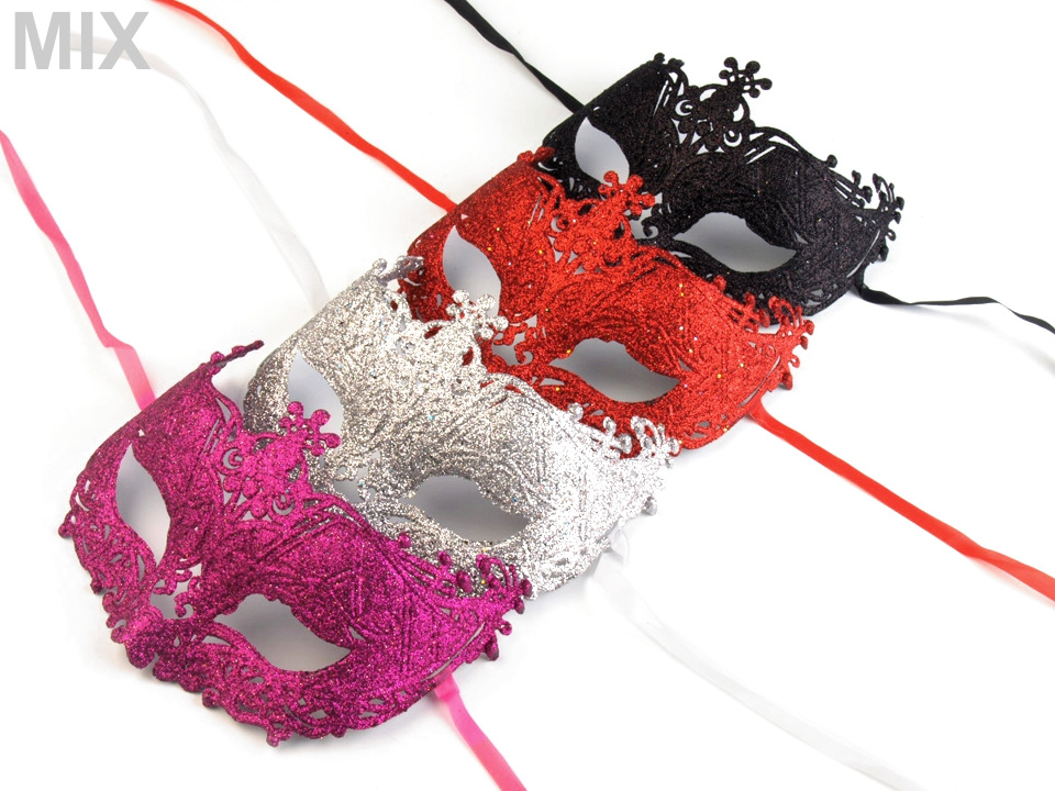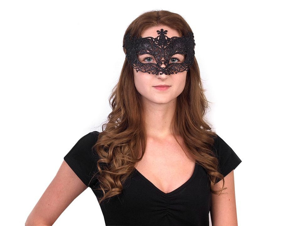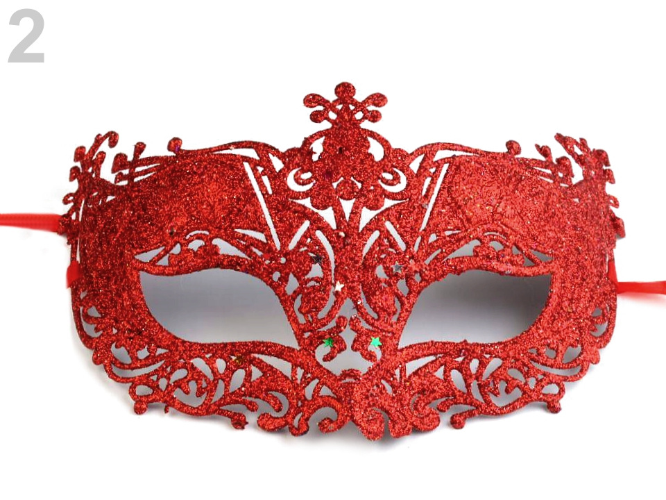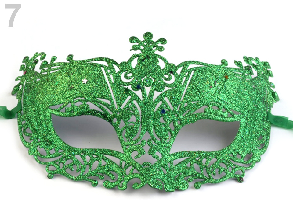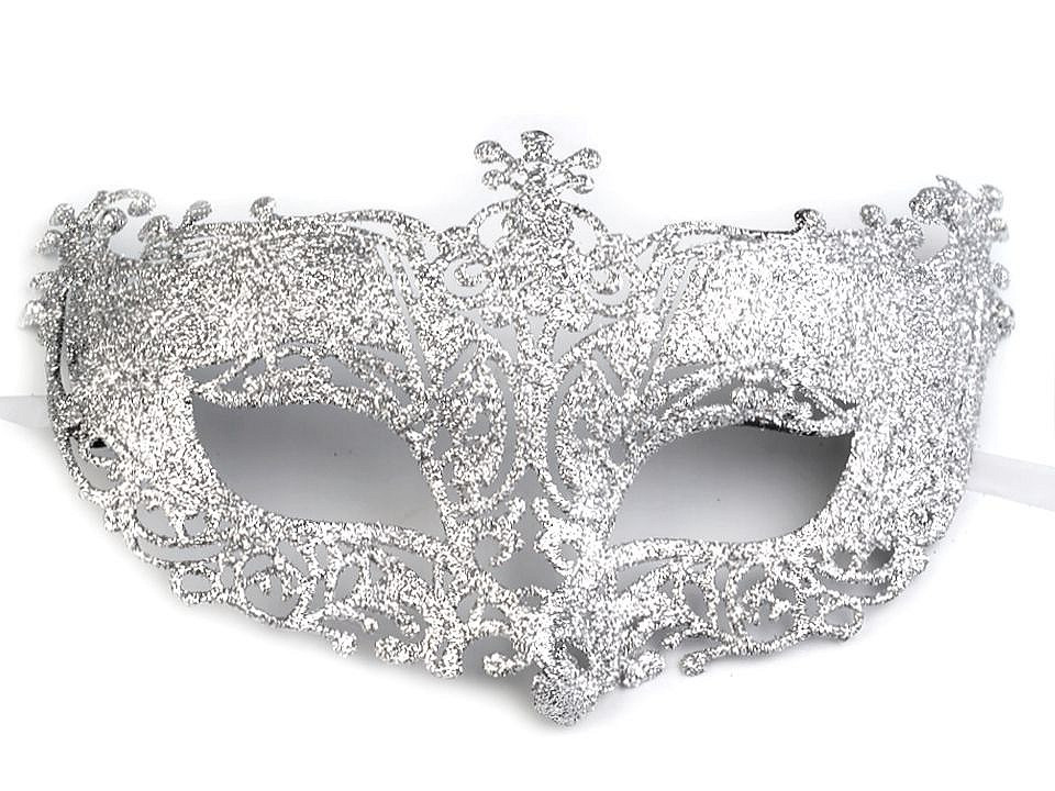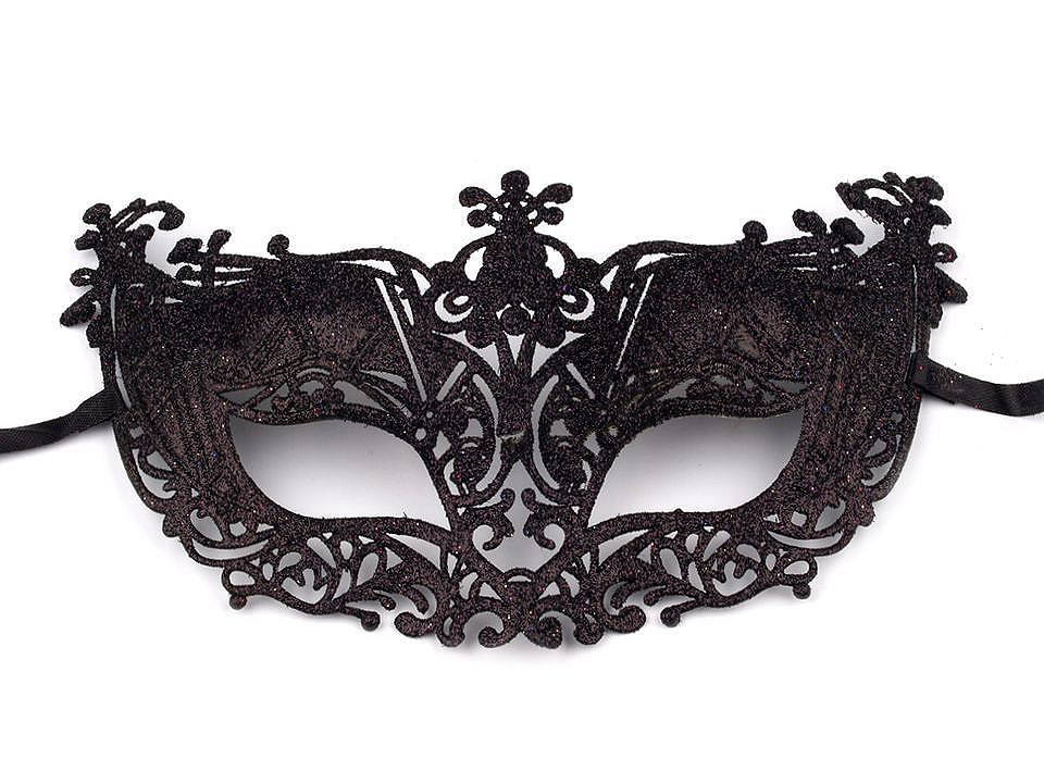 Úchvatná škraboška vypadá jako by byla z jemné krajky. Je však vyrobená z pevného plastu, který dobře drží tvar. Třpytivé glitry dodávají masce dramatičnost. Zazáříte s ní na karnevalech, večírcích nebo na párty. Maska se zavazuje pomocí saténové stuhy.