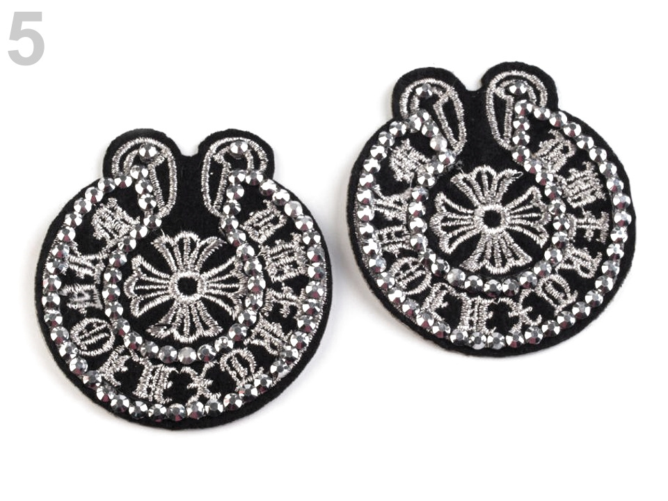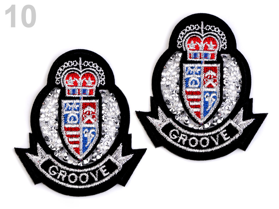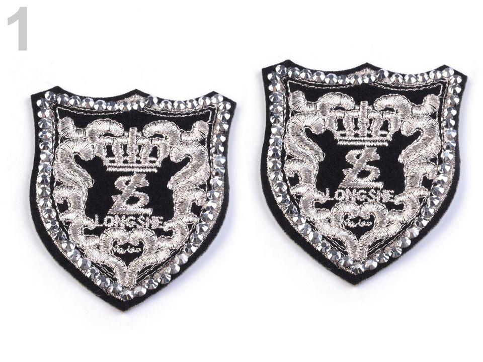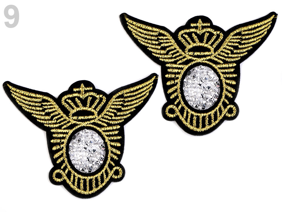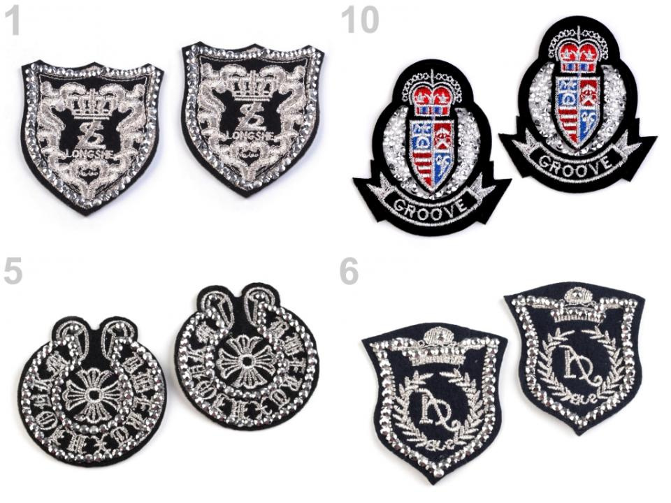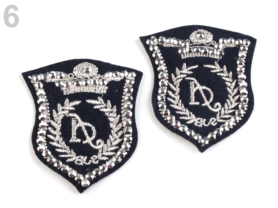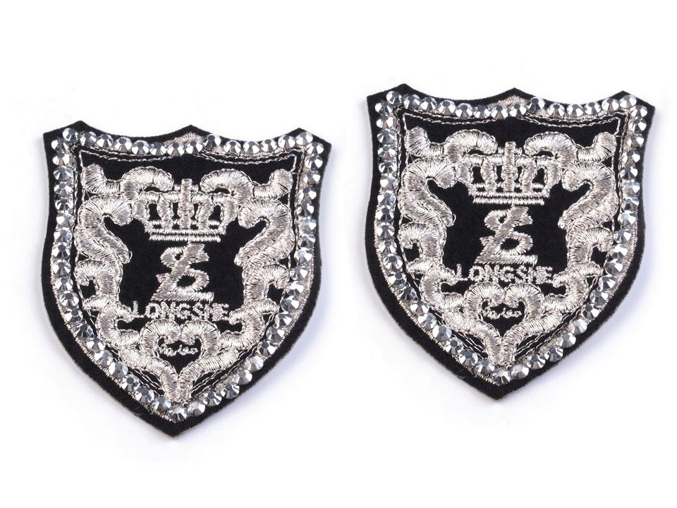 Nažehlovačka se třpytivými kamínky připomíná erb. Exkluzivitu jí přidává lurexová výšivka. Nažehlovačku můžete aplikovat na saka, bundy, košile, mikiny, trička i tašky. Základem nažehlovačky je polyetylénové lepidlo, které po nažehlení pevně drží na oděvu.