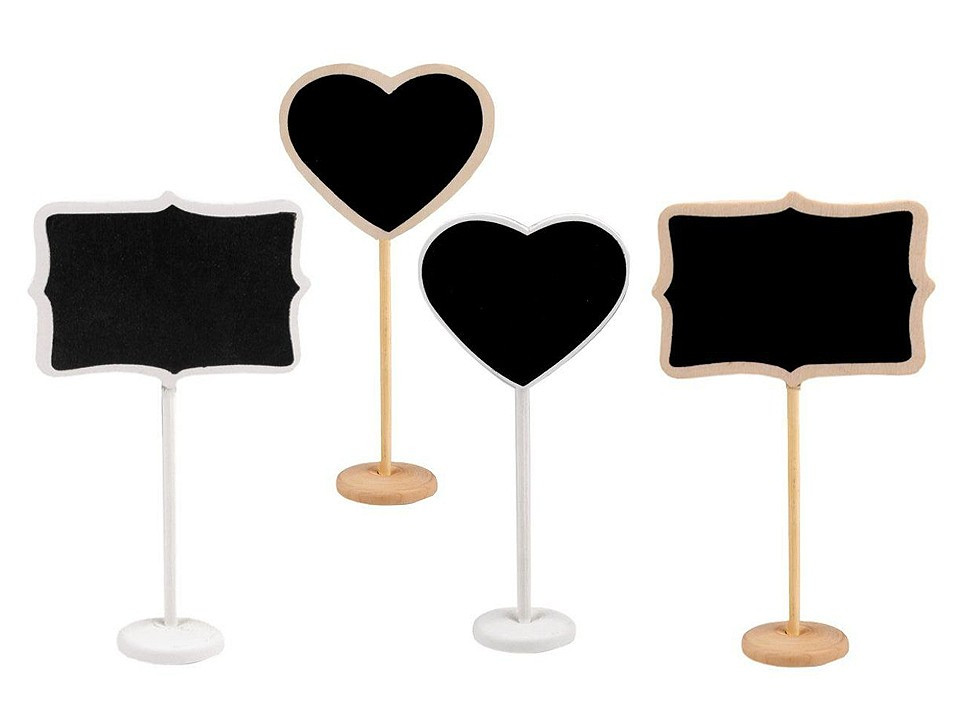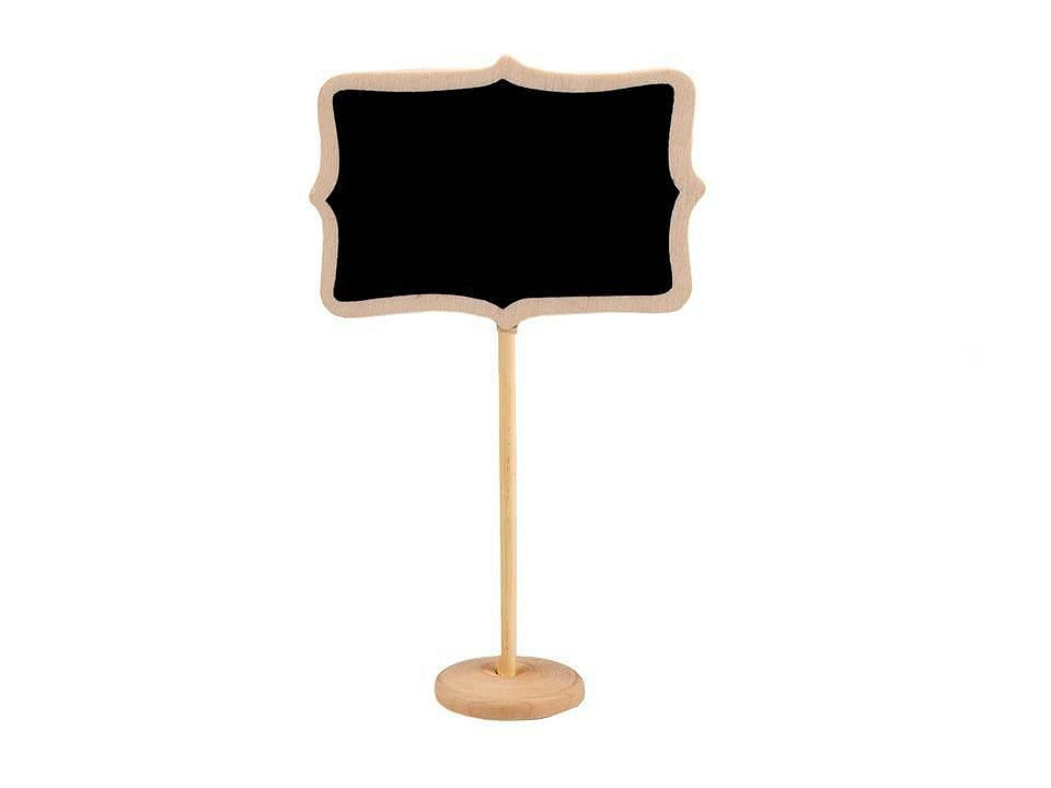 Dřevěná vintage tabulka má praktické využití. Lze na ni psát křídou, kterou pak jednoduše smyjete vlhkým hadříkem. Tabulka má dřevěný stojan (Ø4 cm) s dobrou stabilitou, proto ji můžete využít jako jmenovku, cenovku, vizitku apod. Upoutá pozornost také na svatbě u rautových stolů nebo candy baru.