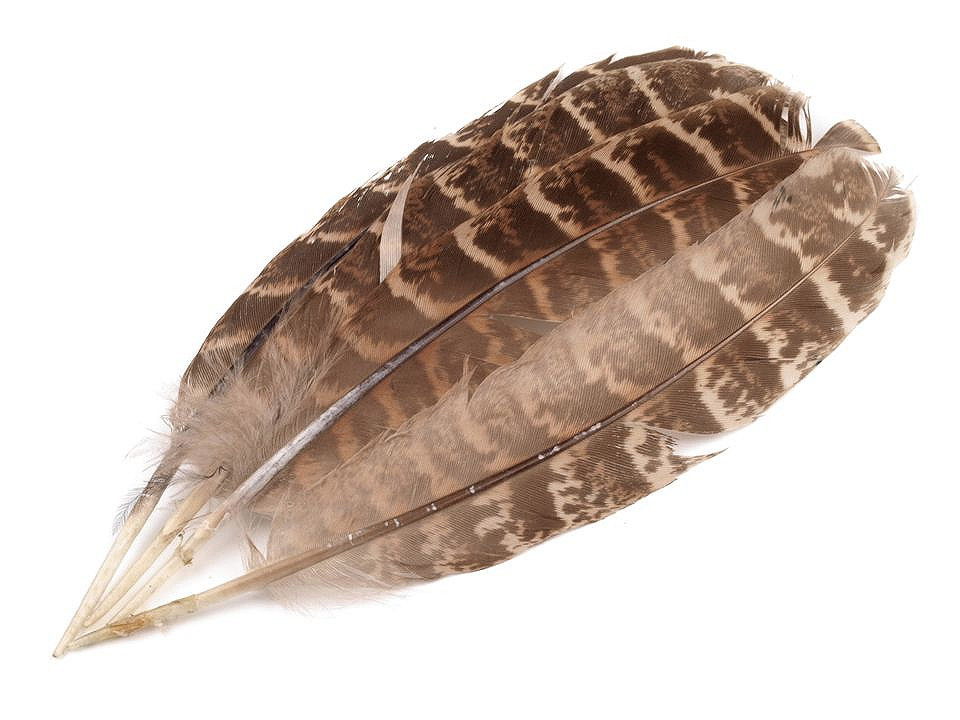 Ozdobné bažantí peří má jedinečný pruhovaný vzhled a jeho barvy jsou laděny do přírodních tónů.