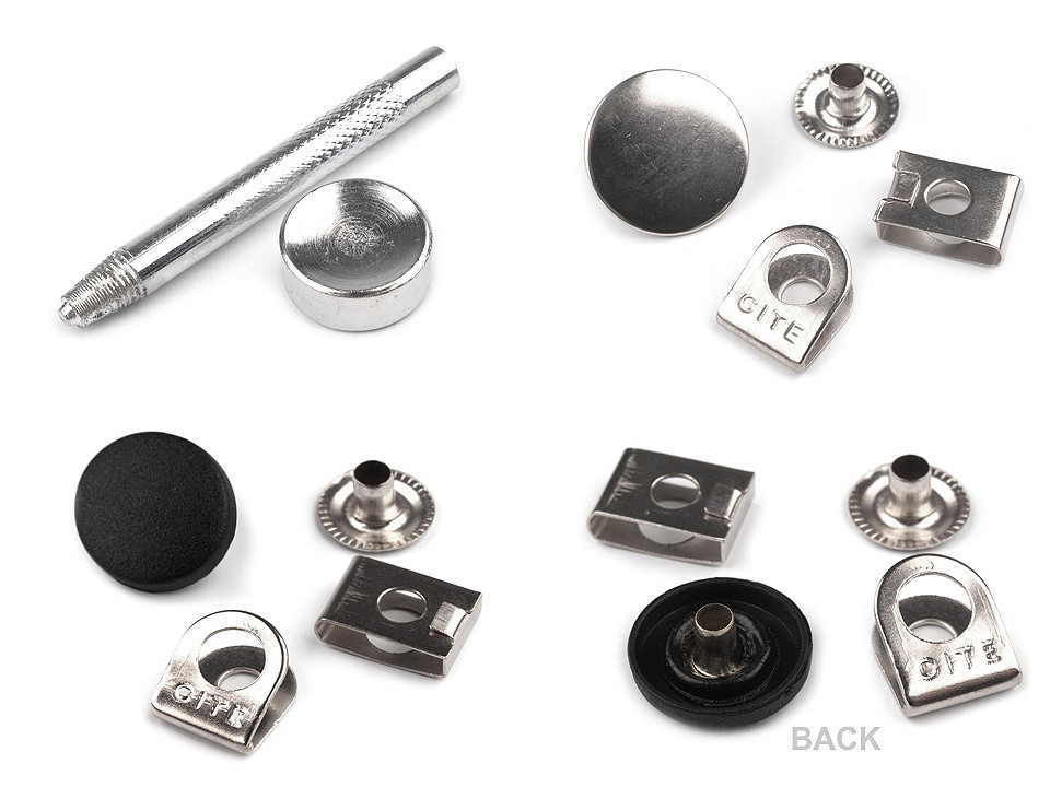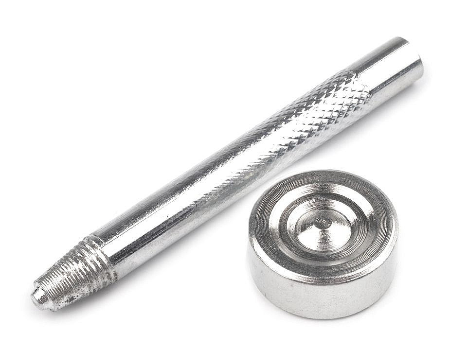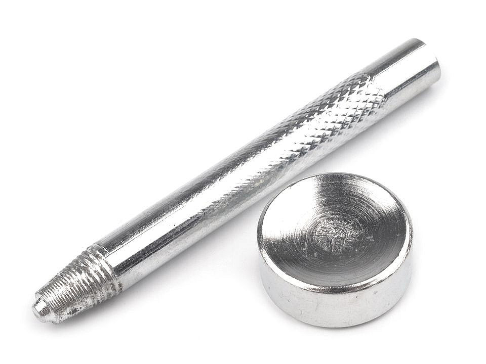Kovový razič využijete k aplikaci narážecích knoflíků, které najdete pod kódem 111542. K raziči patří kulatá kovadlinka (Ø22 mm), která je oboustranná. Na kovadlinku položíte knoflík s příslušnou doplňující částí, přiložíte razič a udeříte do něj kladivem.