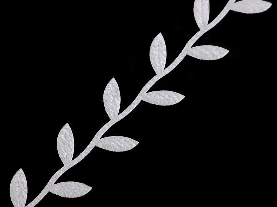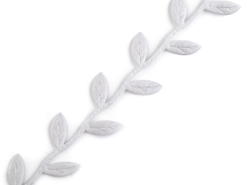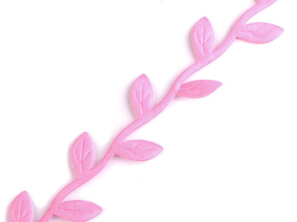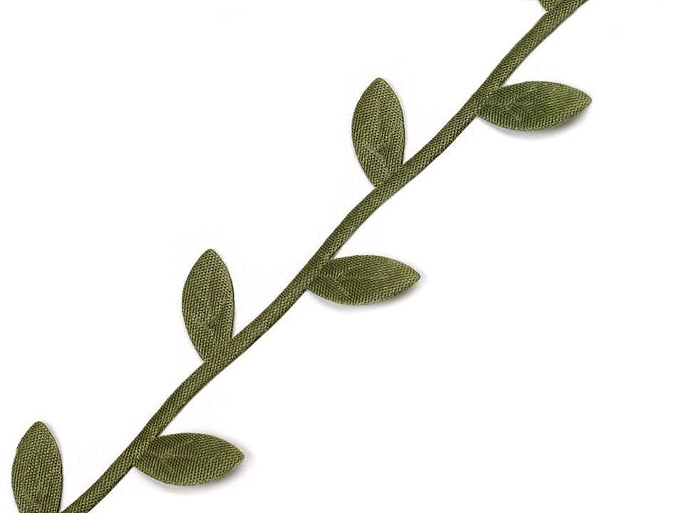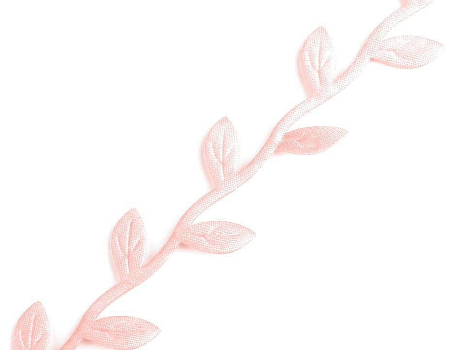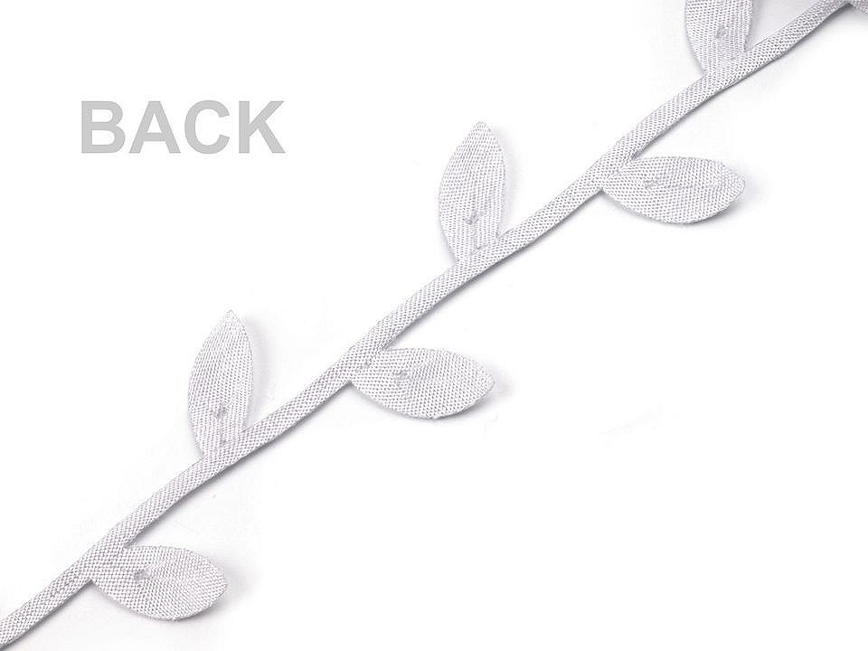 Saténový prýmek s motivem lístečků je vhodný k šití i k dekorování. Listy se dají odstřihnout a použít samostatně. Uprostřed mají vytlačený vzor žilkování.