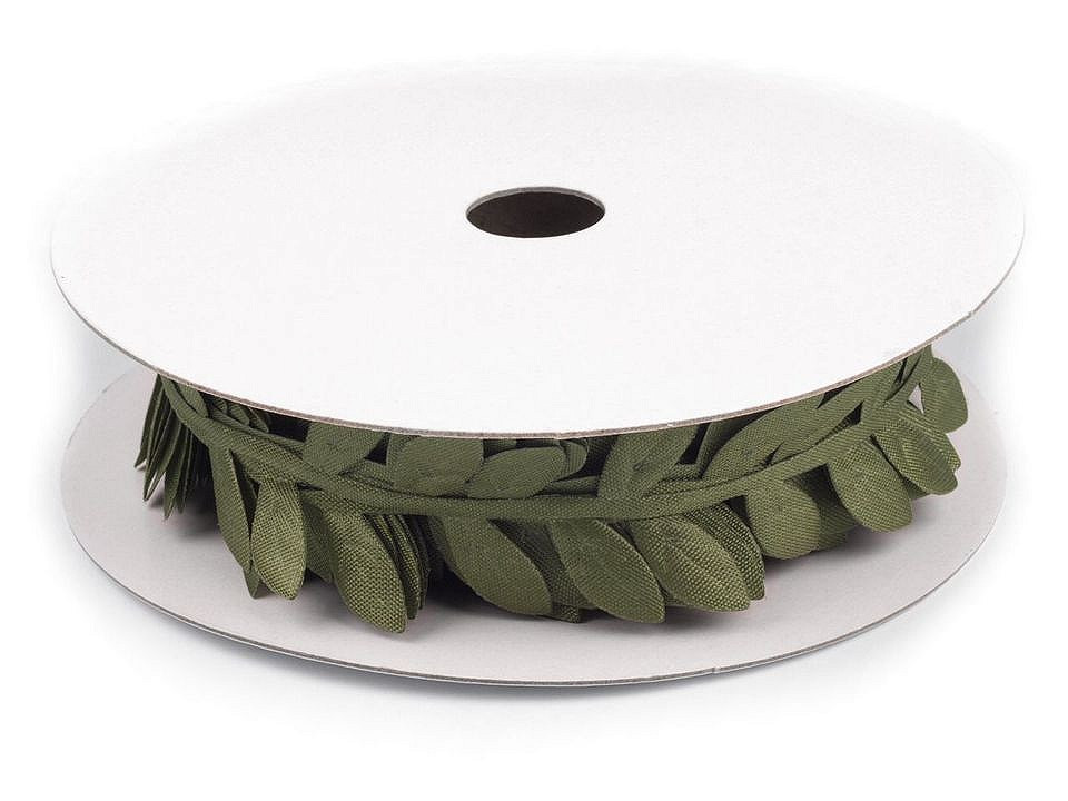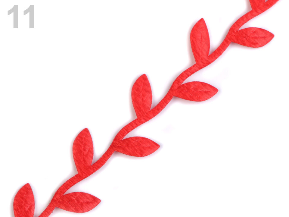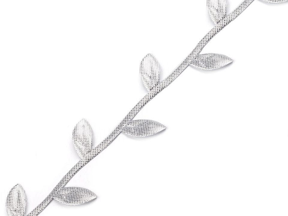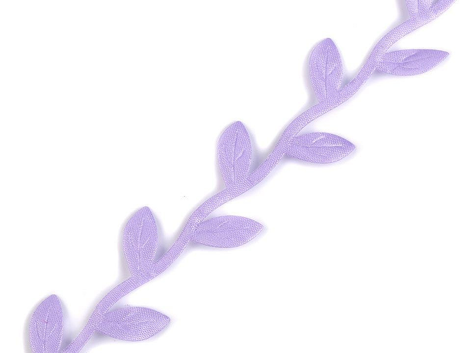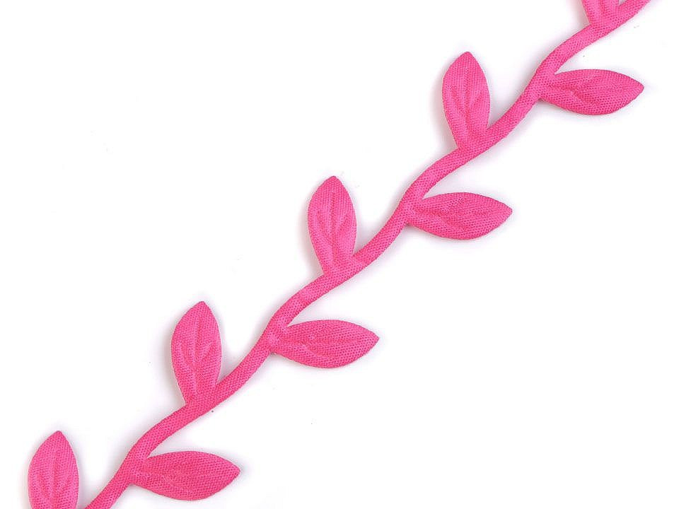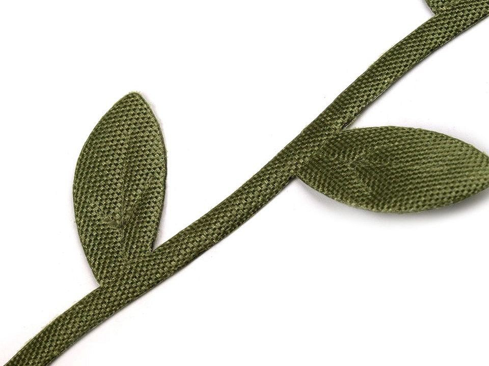 Saténový prýmek s motivem lístečků je vhodný k šití i k dekorování. Listy se dají odstřihnout a použít samostatně. Uprostřed mají vytlačený vzor žilkování.