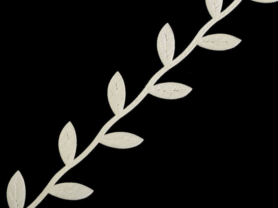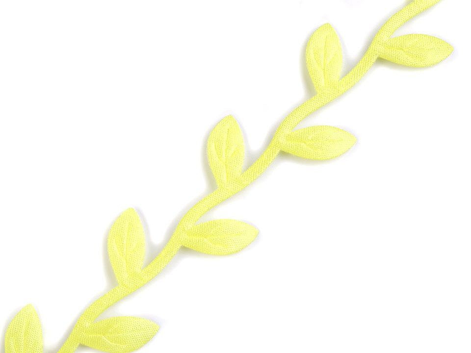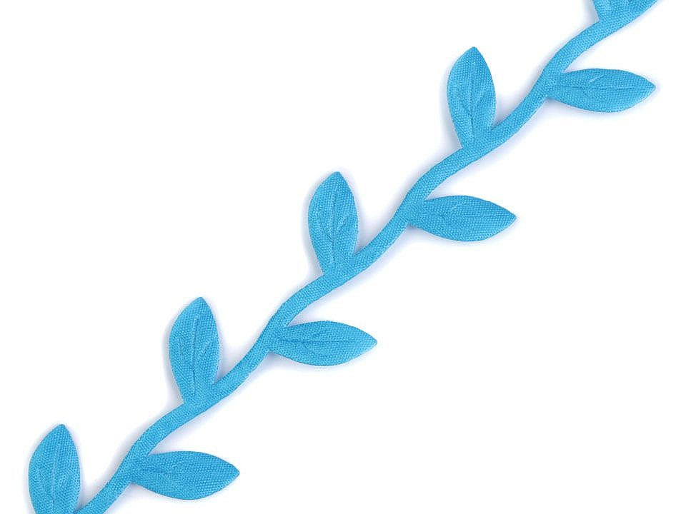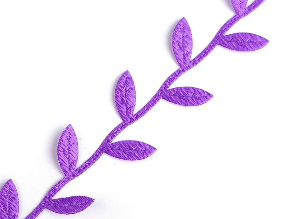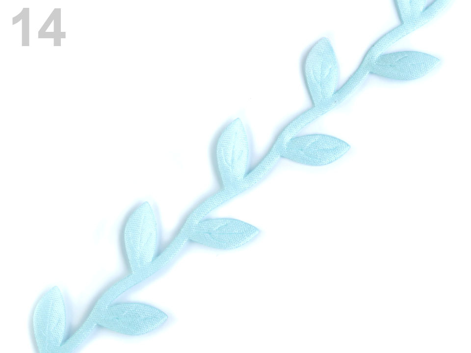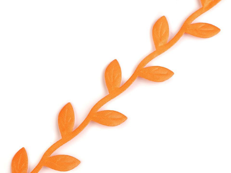 Saténový prýmek s motivem lístečků je vhodný k šití i k dekorování. Listy se dají odstřihnout a použít samostatně. Uprostřed mají vytlačený vzor žilkování.