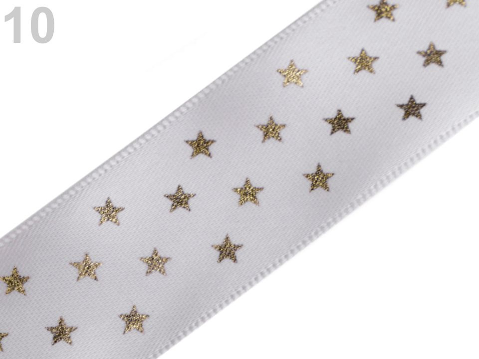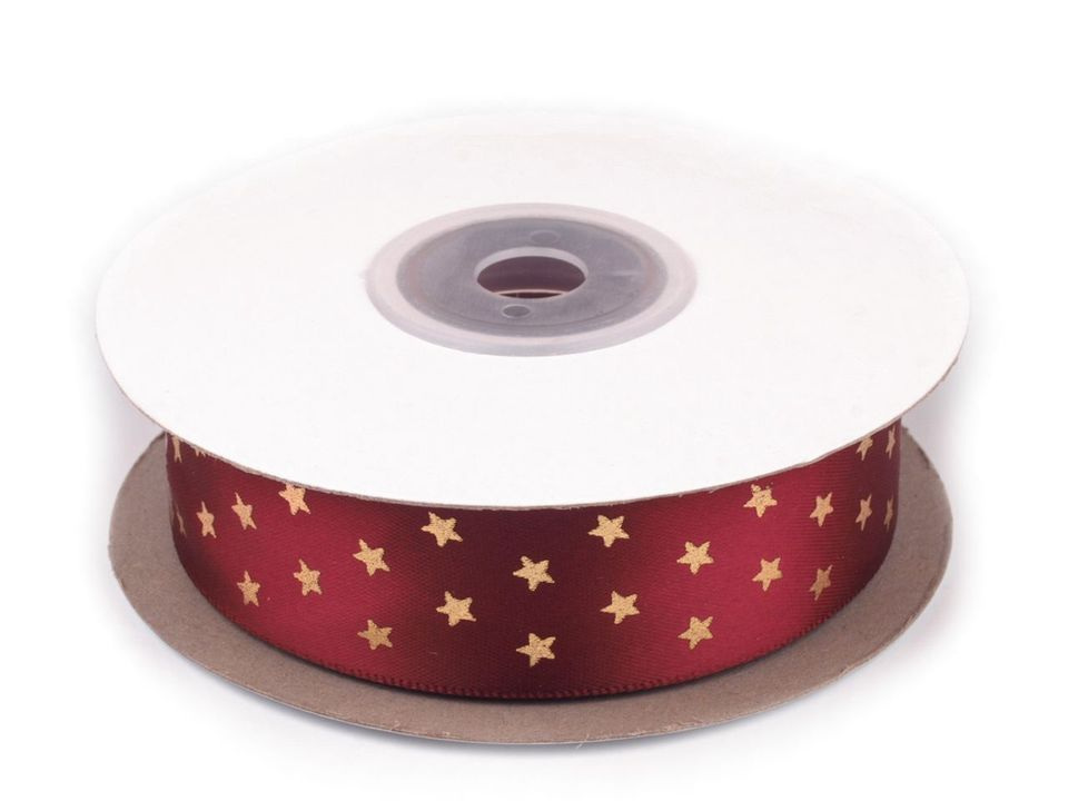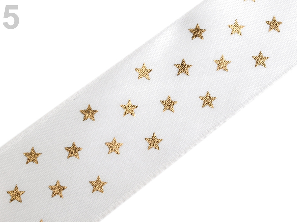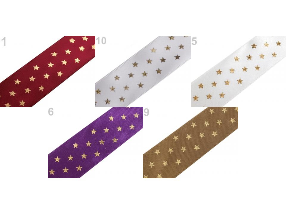 Lesklá atlasová stuha je zdobena jednostranným potiskem zlatých hvězd.