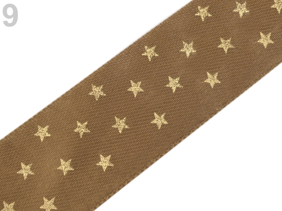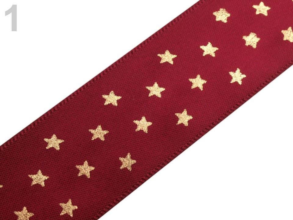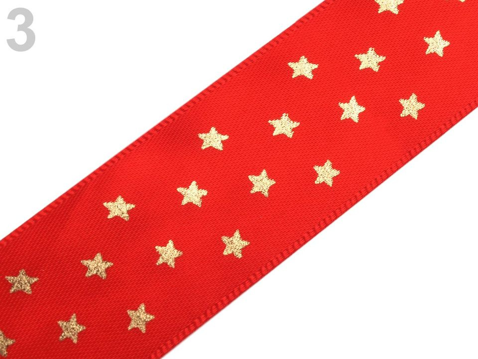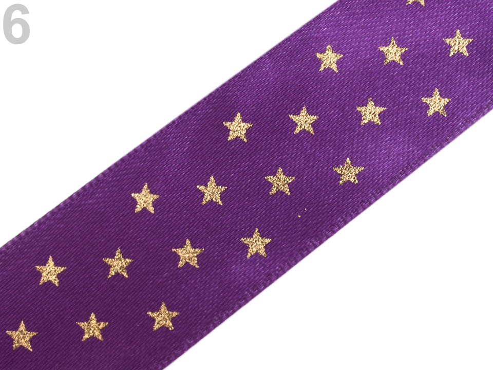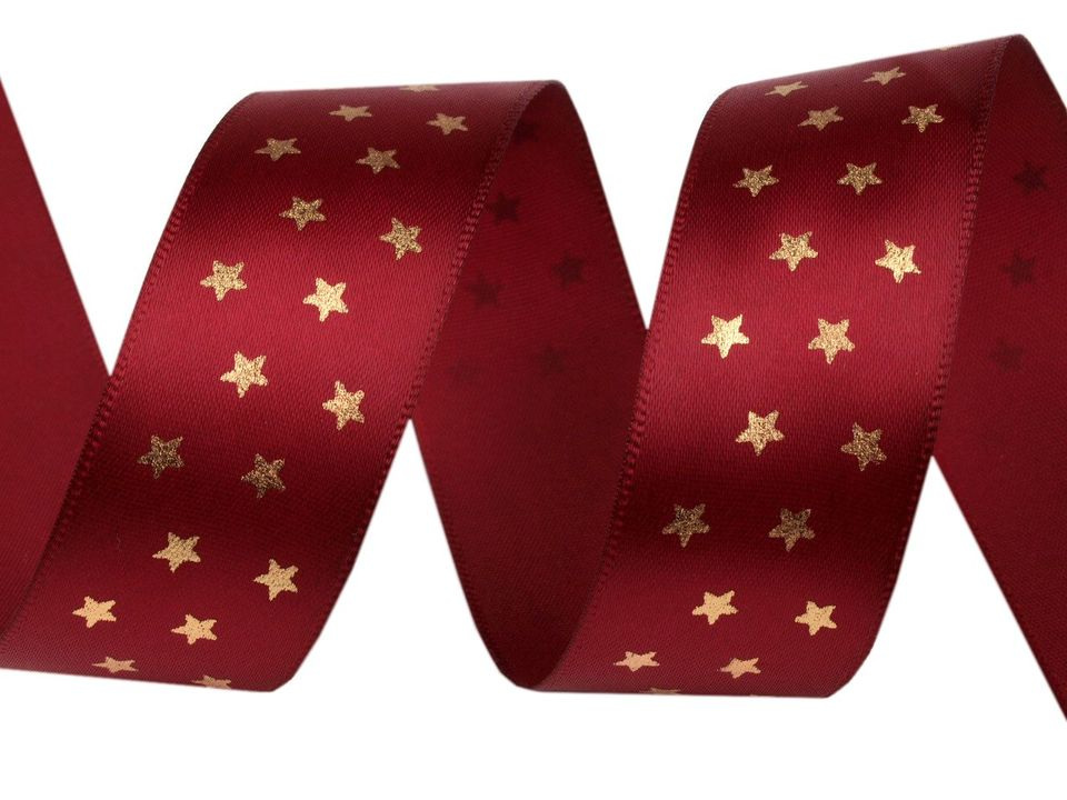 Lesklá atlasová stuha je zdobena jednostranným potiskem zlatých hvězd.