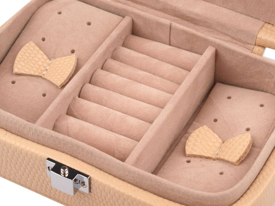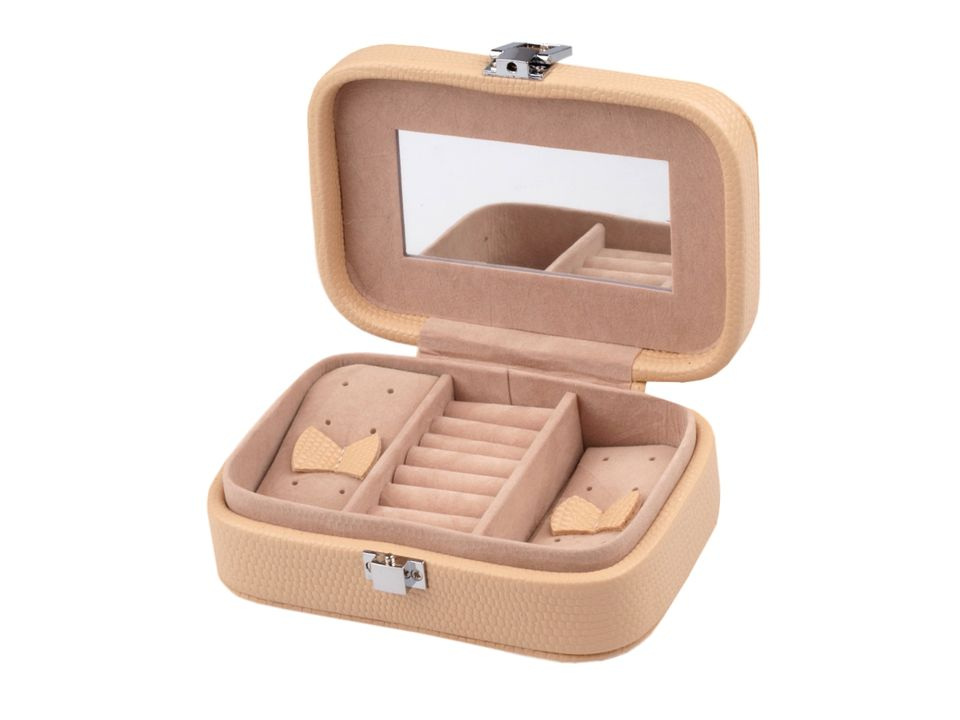 Malá šperkovnice se zrcátkem spolehlivě ochrání vaše prsteny a náušnice před nepříznivými vlivy okolí, jako je světlo nebo vlhkost. Elegantní provedení v imitaci hadí eko kůže s kovovým zapínáním nadchne většinu žen. Šperkovnice má velice kvalitní a precizní provedení. Celá je vypolstrovaná umělým semišem.