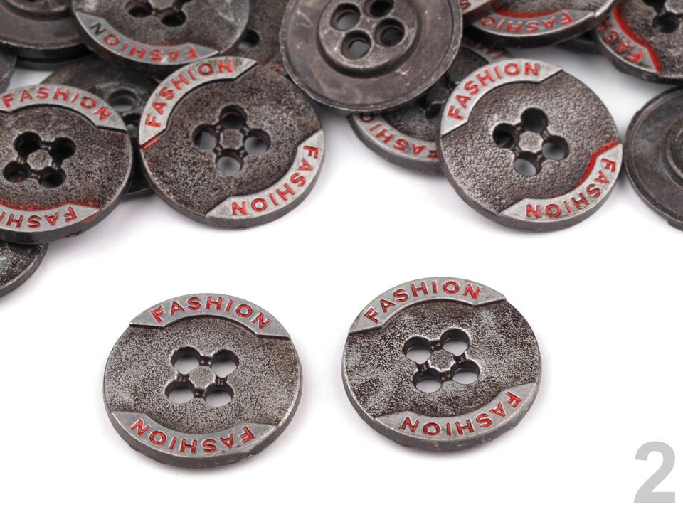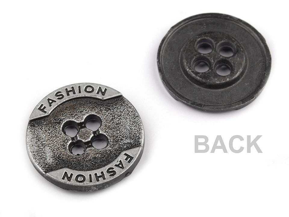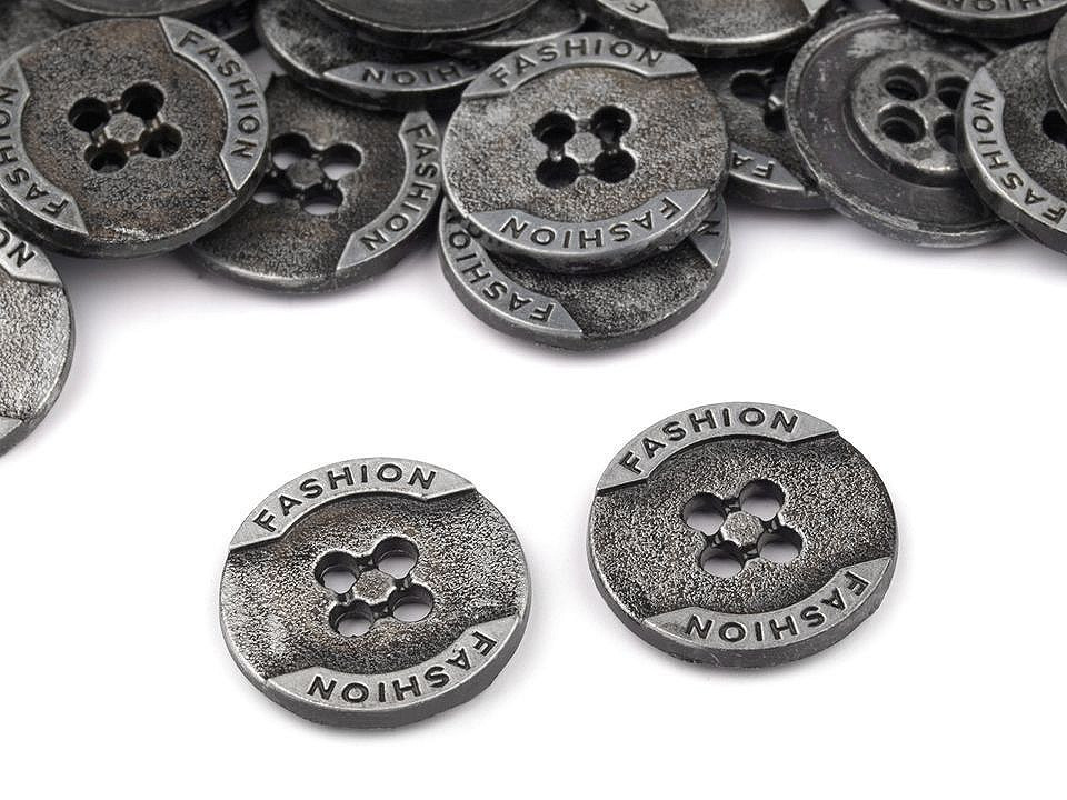 Čtyřdírkové kovové knoflíky jsou kvalitní a vyrobené z nemagnetického kovu. Zdobí je nápis "fashion". Využijete je k našití na košile, mikiny, bundy apod.
