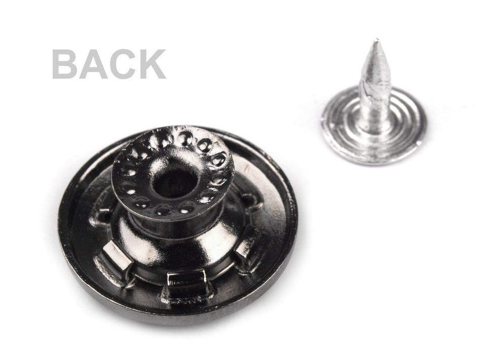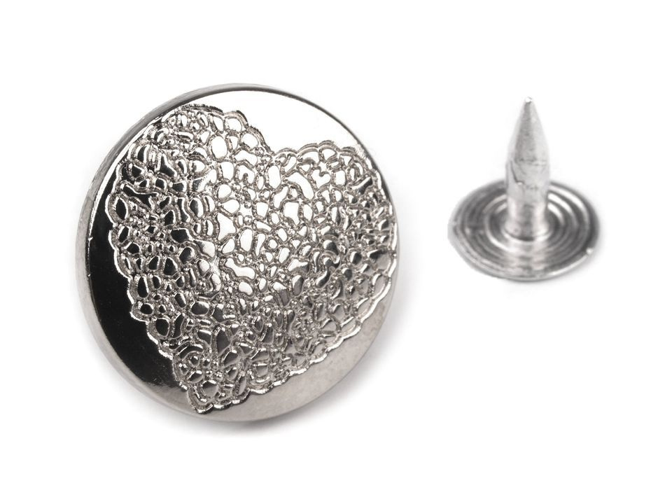 Kovový narážecí knoflík se skládá ze dvou částí, které se do sebe musí narazit (například kladivem). Má zajímavý design se srdíčkem. Knoflík využijete na džíny, džínové bundy nebo vesty.